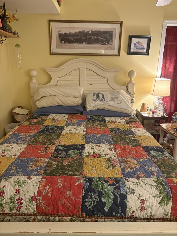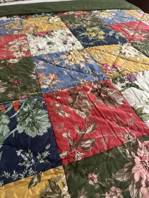 The handcrafted Company Cotton™ Aaliyah Patchwork Quilt is artfully pieced from vintage floral prints in opulent hues celebrating autumn's glorious colors, from ink blue, denim, olive, and gold to fuchsia, chili red, russet, and ivory. The patchwork squares are beautifully framed with a border of pretty vining flowers. Handcrafted by skilled artisans and washed for lived-in softness, it's as comfortable as it is beautiful.