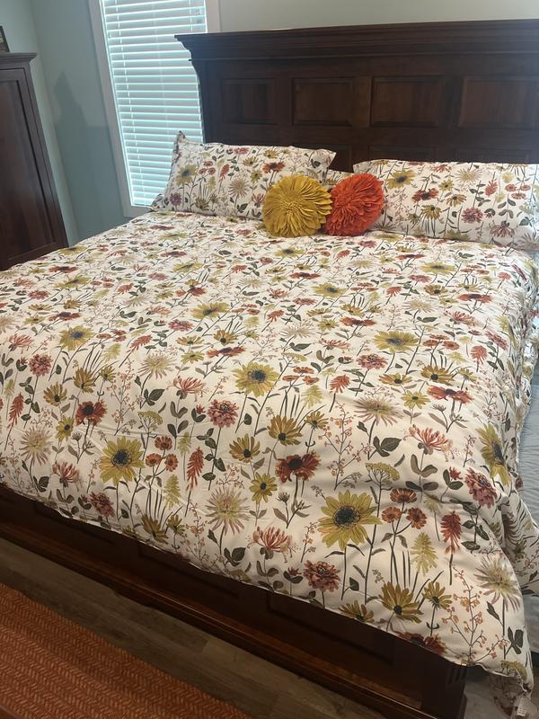 Our Company Cotton™ Daisies Sateen Comforter brings warmth and good cheer to the bed in amber, gold, terracotta, magenta, and olive on navy or cream. Crafted of buttery-soft and breathable sateen, this bedding collection has a subtle sheen and is perfect for all-season comfort.