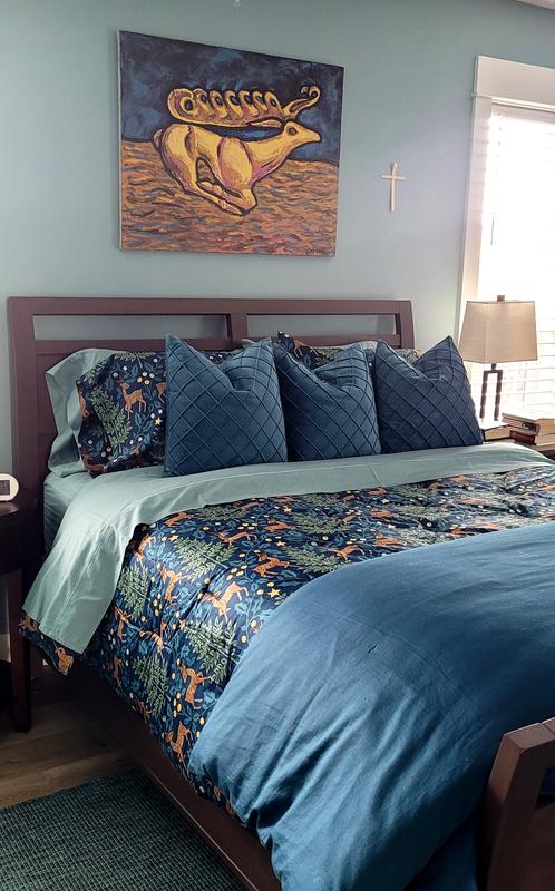 Our Company Cotton™ Reindeer Sateen Comforter is inspired by an antique tapestry, with stylized reindeer, holly branches, and Christmas trees on a navy ground in a palette of steel blue, sage green, pale yellow, and camel. Crafted of buttery-soft and breathable sateen, this bedding collection has a subtle sheen and is perfect for all-season comfort.