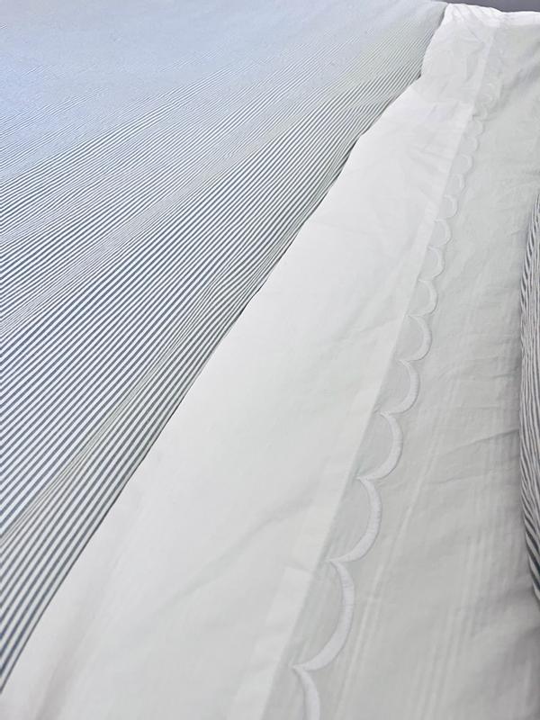 The product features a classic percale fabric with a soft, crisp feel and an elegant scalloped trim design. Many customers were very satisfied with the quality and aesthetic of the sheets, though some noted they felt a bit thin or wrinkled easily. Overall, the majority of reviewers found the product to be of good value and would recommend it.