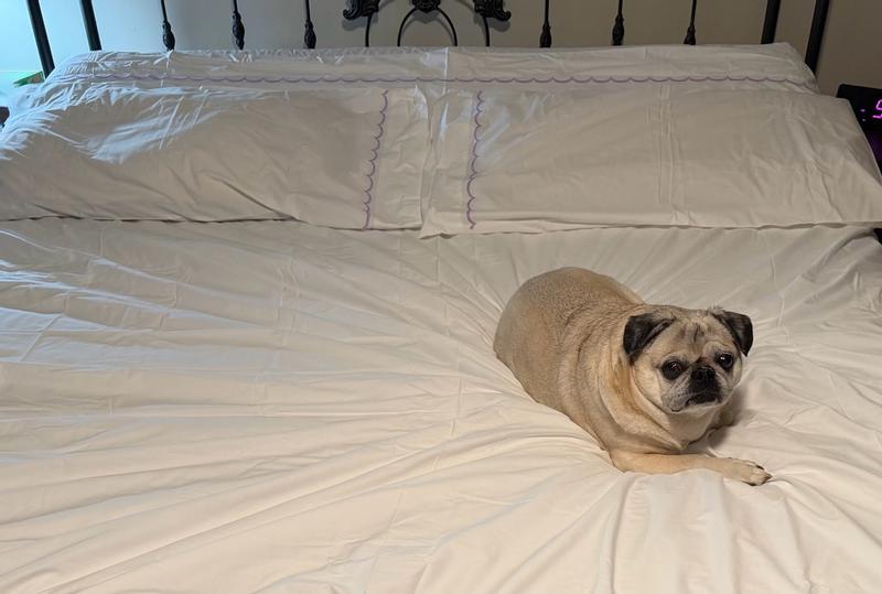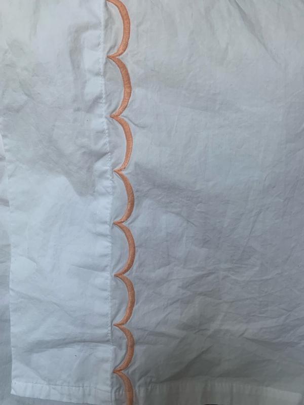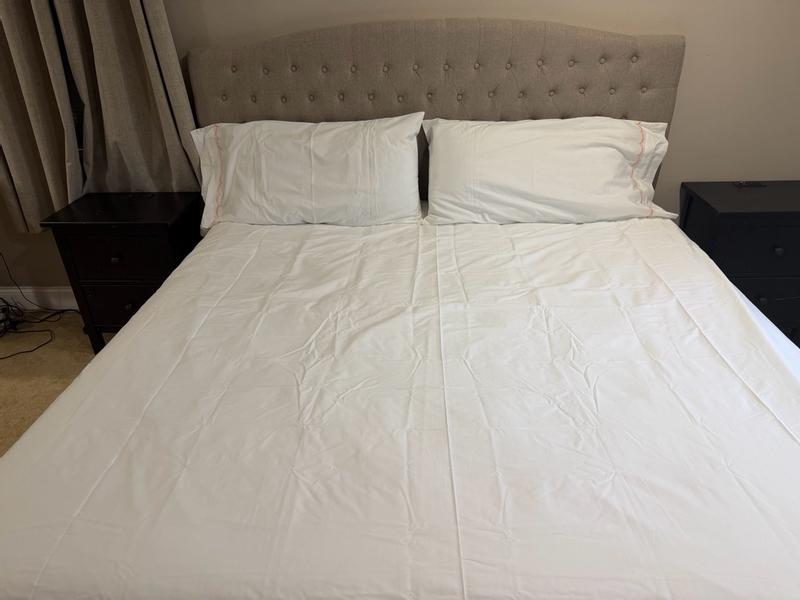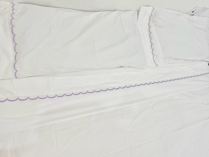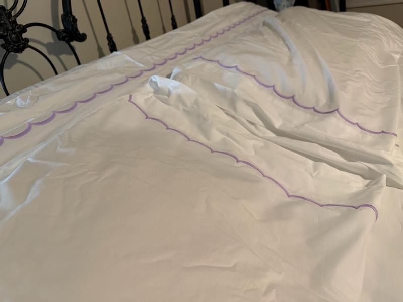 The product features a classic percale fabric with a soft, crisp feel and an elegant scalloped trim design. Many customers were satisfied with the quality and aesthetic of the sheets, though some noted they wrinkled easily even after following care instructions. Overall, the majority of reviewers found the product to be of good value and would recommend it.