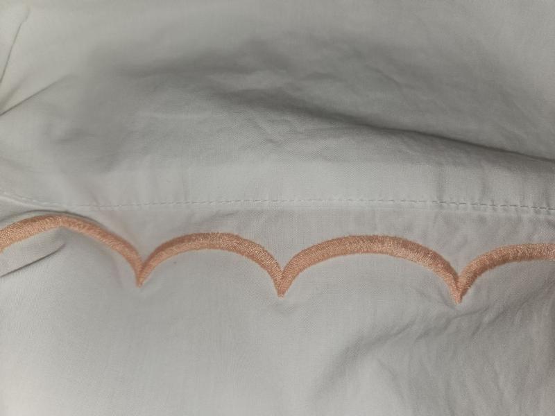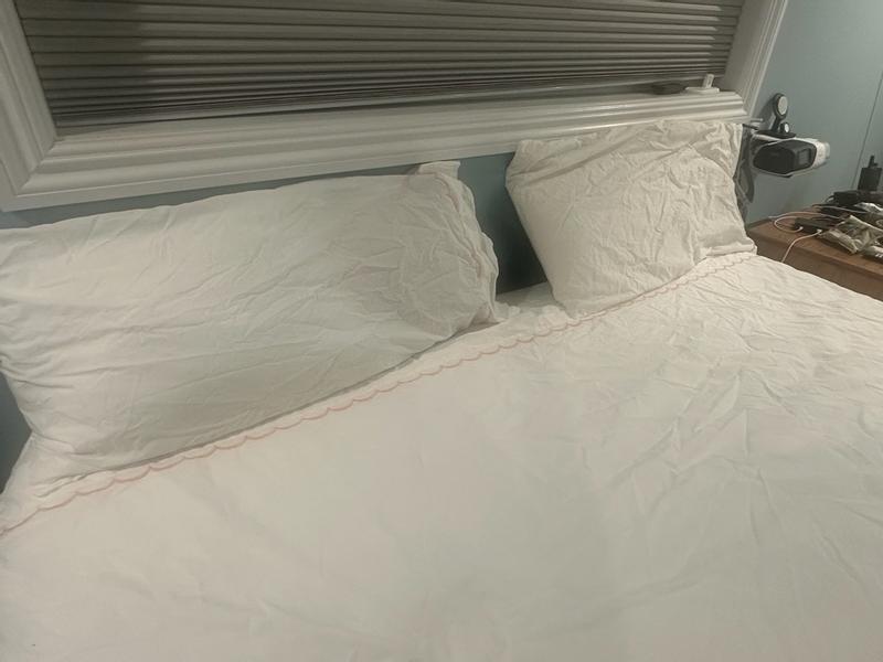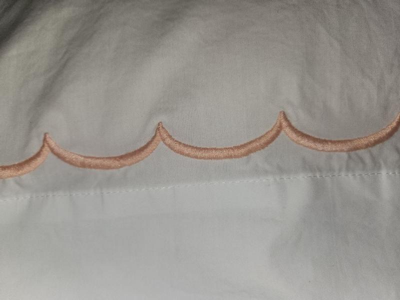The product features a soft, crisp percale feel and an elegant scalloped trim design. Many customers were satisfied with the quality and found the sheets to be a great value. However, some reported the sheets felt too thin or rough initially and tended to wrinkle easily, and noted the scalloped trim was only on one side of the pillowcases. Overall, the majority of reviews highlight the product's classic percale texture and decorative trim as positive attributes.