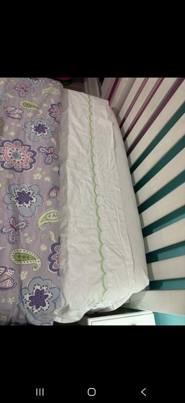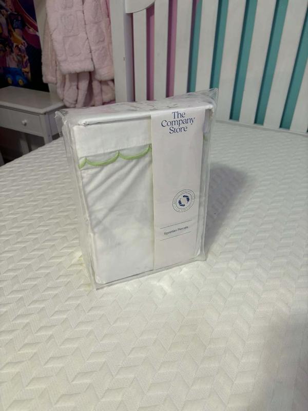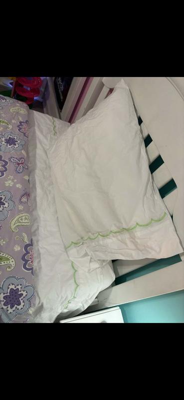 The product features a soft, crisp percale feel and an elegant scalloped trim design. Many customers were satisfied with the quality and found the sheets to be a great value. However, some reported the sheets felt too thin or rough initially and tended to wrinkle easily, and noted the scalloped trim was only on one side of the pillowcases. Overall, the majority of reviews highlight the product's classic percale texture and decorative trim as positive attributes.
