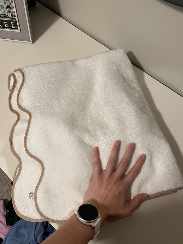 - Towels are finished with scalloped edges trimmed with contrast cotton binding