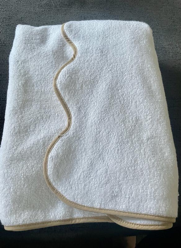 - Towels are finished with scalloped edges trimmed with contrast cotton binding