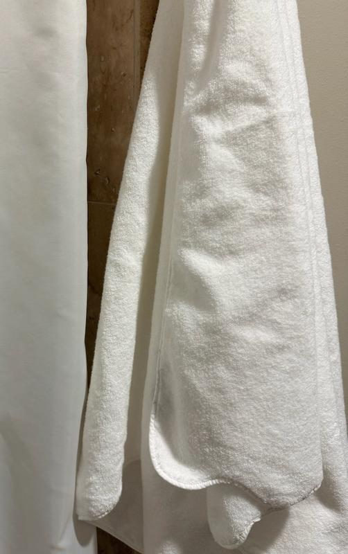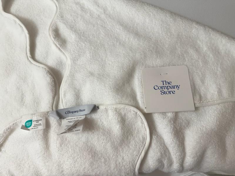 - Towels are finished with scalloped edges trimmed with contrast cotton binding