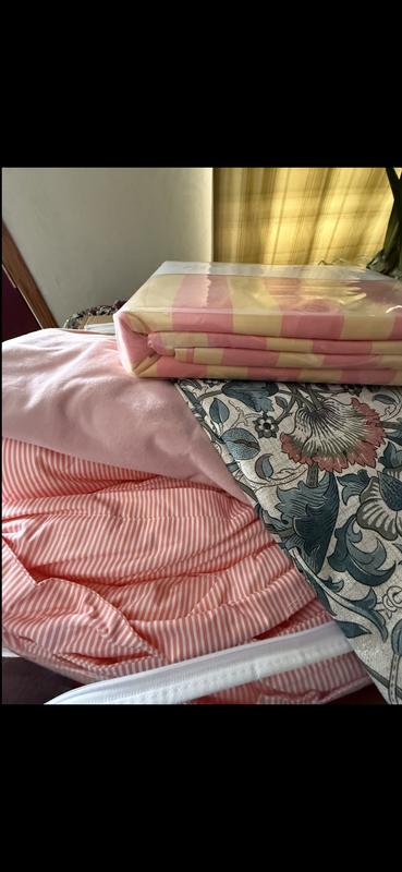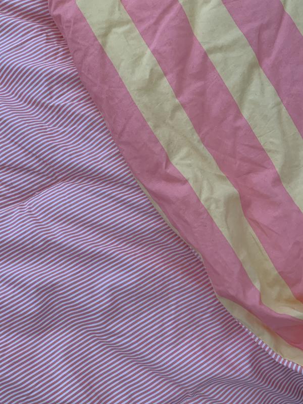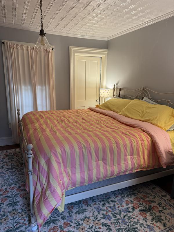 Designed to mix and layer with joyful abandon, our Company Cotton™ Sunshine & Blooms Percale Comforter brightens the bed in your choice of pink and coral or cool blue colorways. Choose from floral, mini floral, plaid, and pinstripe prints. For bold contrast and in addition to the comforter, the duvet cover and shams in this collection (sold separately) are offered in a reversible design, featuring wide awning stripes on one side and classic pinstripes on the other. Delicate ruffle edging accents the matching sheet set and pillowcases, while a polished flange adds a refined touch to the duvet cover, comforter, and shams.