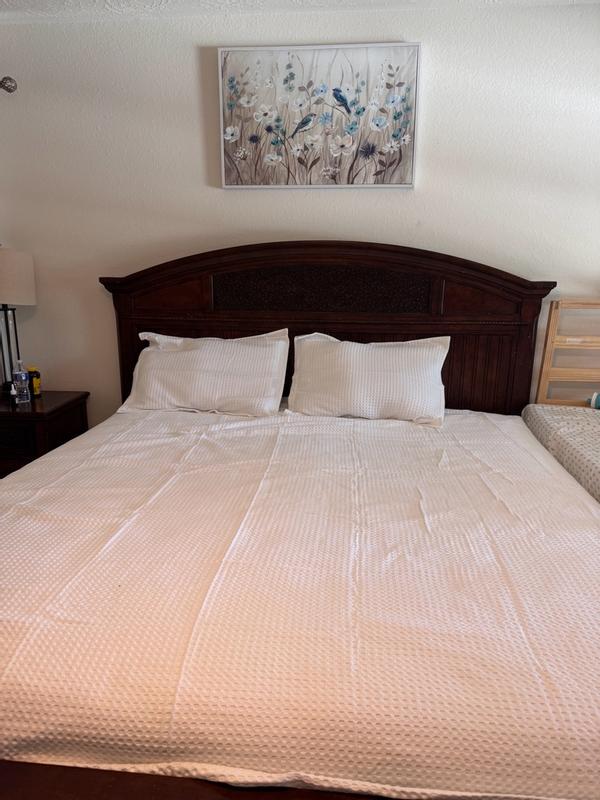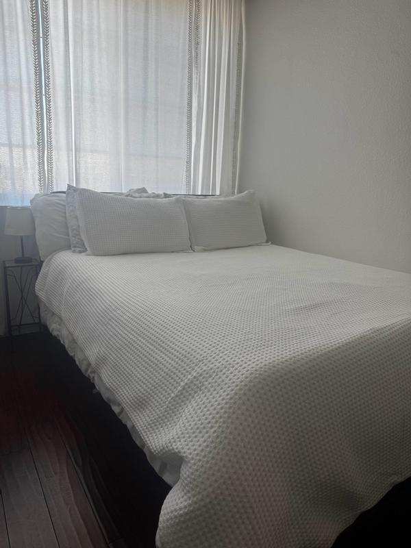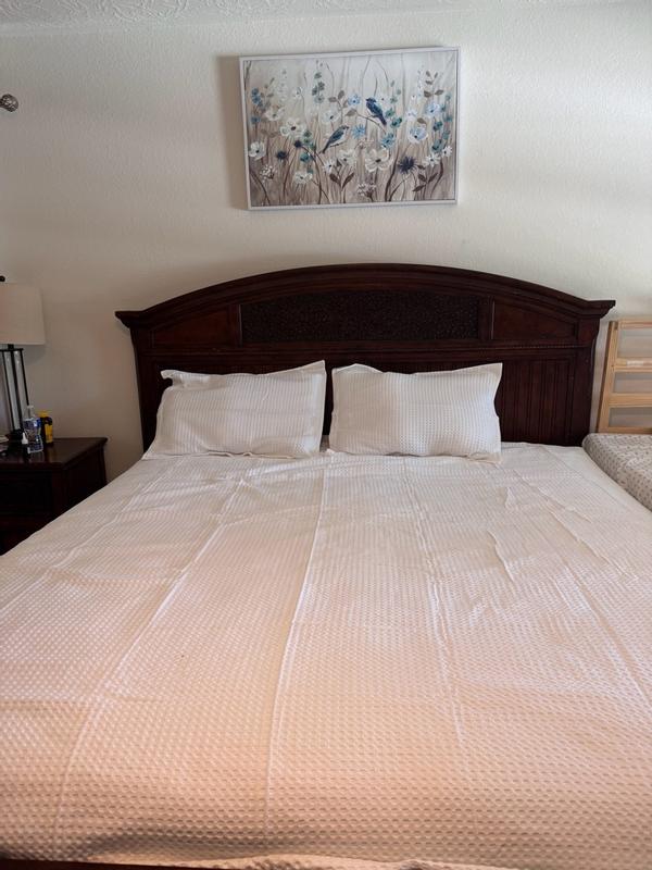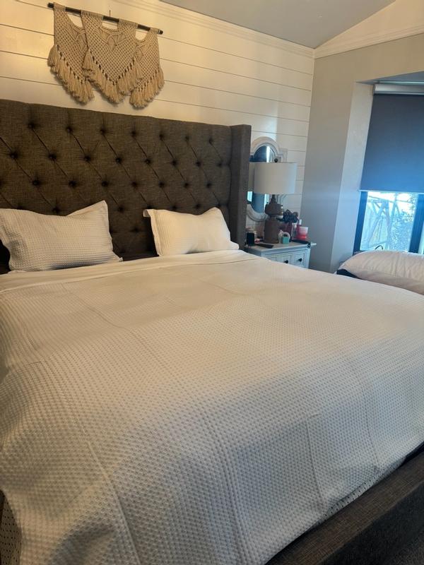 The waffle duvet cover is described as having high-quality construction and design, with a soft, lightweight, and durable fabric that creates a crisp, elegant appearance. Customers praise the beautiful and luxurious waffle texture, which provides a hotel-like feel. The easy-to-use features, such as corner ties and buttons, are also highlighted. While a few customers found the texture slightly scratchy, the majority were extremely satisfied with the sophisticated and comfortable addition to their bedding.