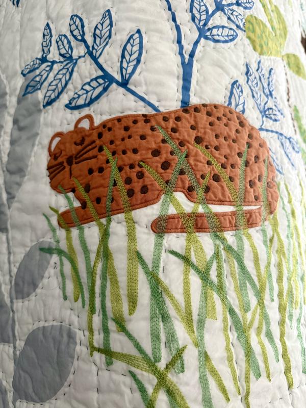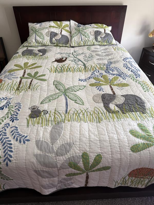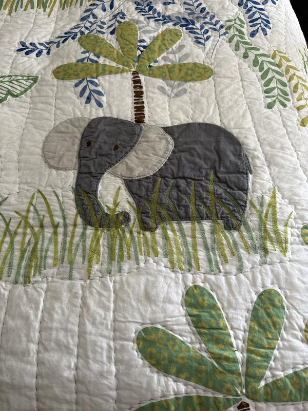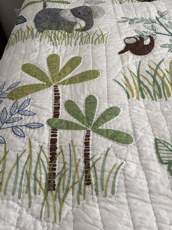 Little adventurers will adore hanging out with the friendly appliqué elephants, monkeys, leopards, and sloths that play in the lush landscape of our handcrafted cotton quilt. It’s a jungle out there! Designed to coordinate with our Jungle kids’ bedding, it’s cast in cheerful shades of blue, green, orange, gold, gray, and blue on a white ground; embroidered accents and quilt stitching add textural dimension.