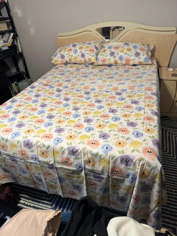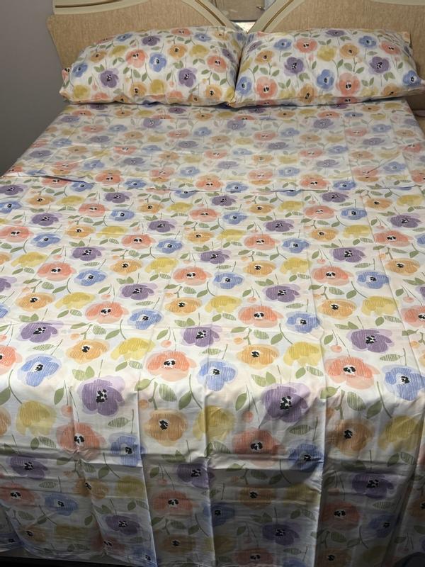 Pastel Poppies Classic Cool Organic Cotton Percale Bed Sheet Set - White Multi, Queen