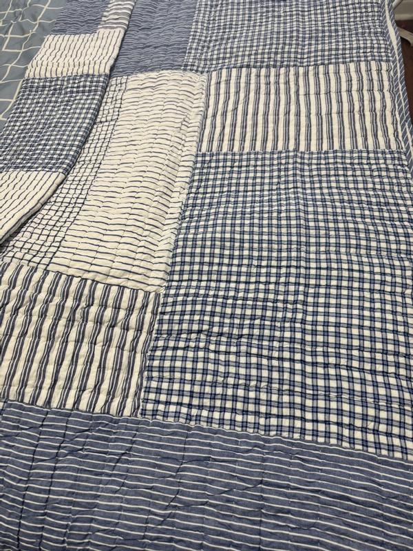 A timeless look for kids’ room, this handcrafted patchwork is a classic mix of stripes, checks and plaids in versatile denim blue, navy and white. Sewn of yarn-dyed cotton for long-lasting color and finished with striped binding, the lightweight quilt makes a great year-round layer.