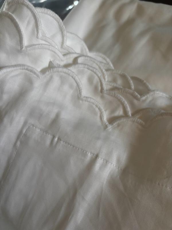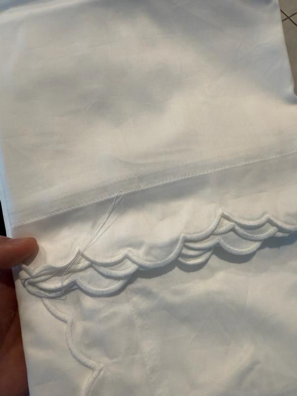 - Scalloped edges are finished with embroidered trim