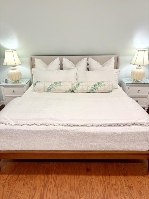 A luxury for any season, this silky white cotton sateen sham is exquisitely finished with delicate scalloped edges; embroidered trim adds a pop of color and effortless charm. Buttery soft, with exquisite drape and a lustrous sheen, it coordinates with our Solid Sateen Bedding (sold separately).