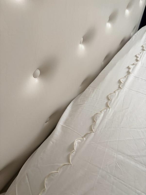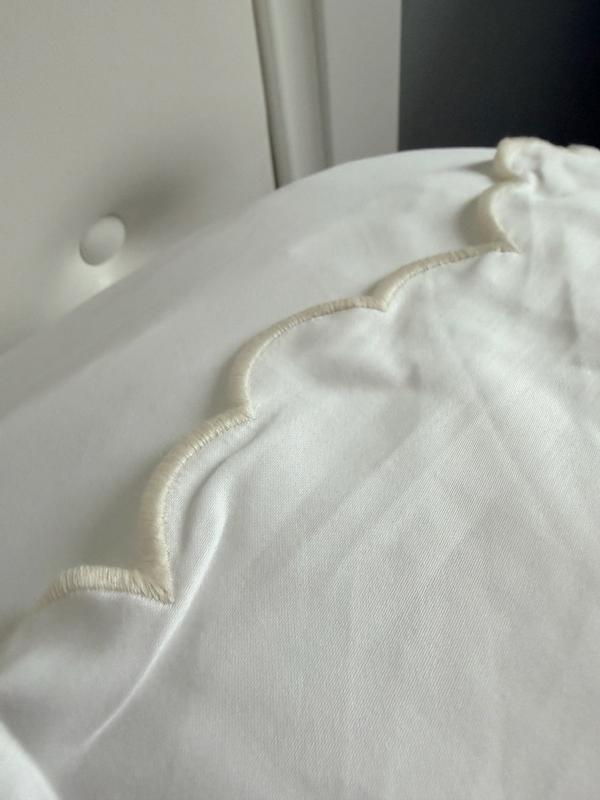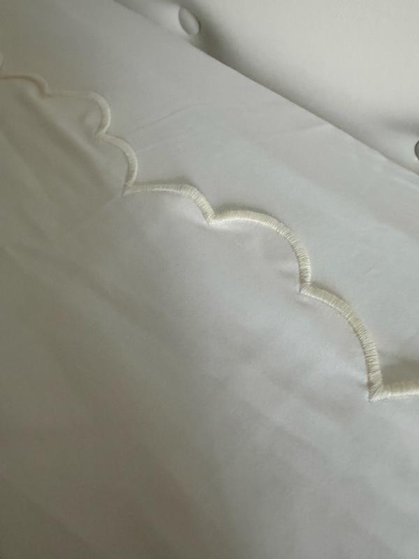 A luxury for any season, this silky white cotton sateen sheet set is exquisitely finished with delicate scalloped edges; embroidered trim adds a pop of color and effortless charm. Buttery soft, with exquisite drape and a lustrous sheen, it coordinates with our Solid Sateen Bedding (sold separately).