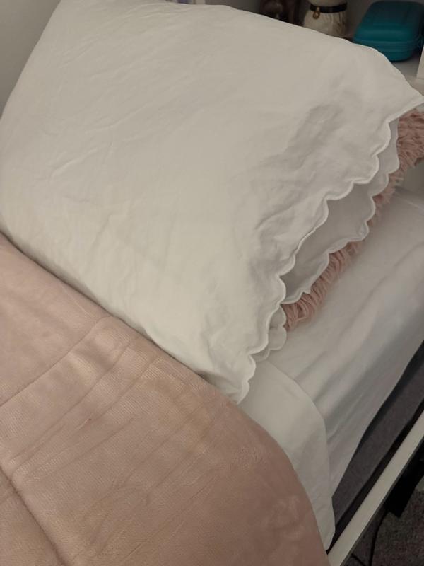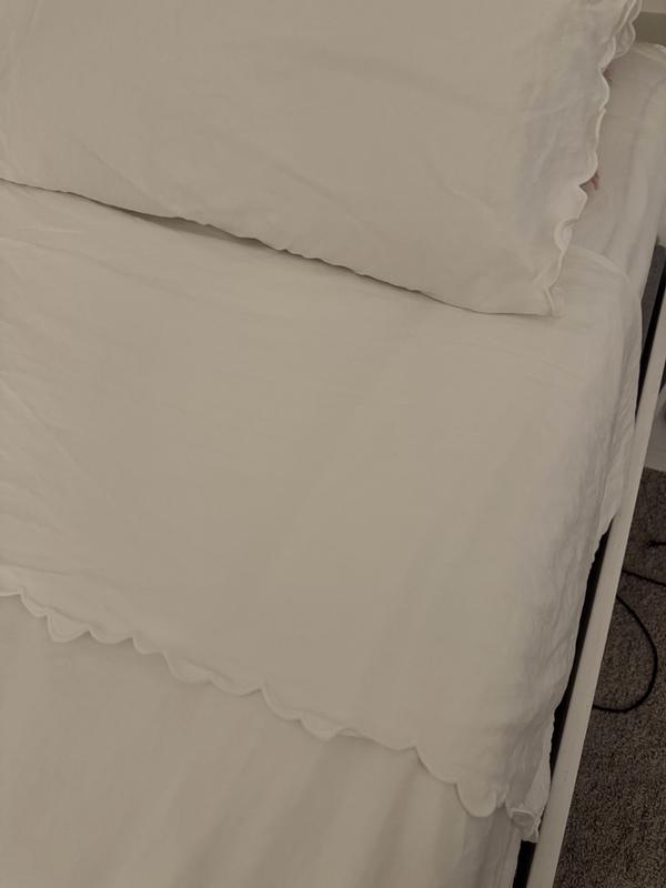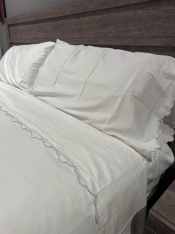 The sheets are praised for being soft, cozy, and high-quality. Customers highlight the beautiful embroidered scallop detail as a standout feature that adds elegance. The sheets are also noted for their breathability, durability, and ability to maintain softness after washing. However, some customers find the sheets can be thin and prone to wrinkling, and wish the scalloped edging went all the way around. Overall, the sheets provide a luxurious and comfortable sleeping experience.
