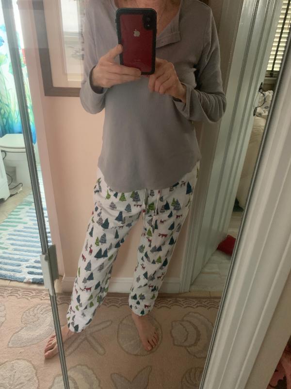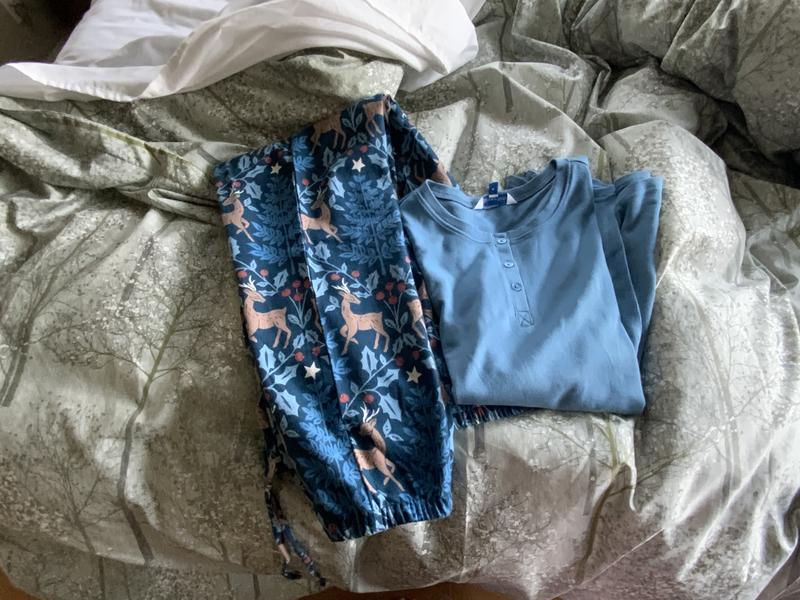 - Women’s two-piece pajama set features cozy flannel bottoms and a thermal-knit top