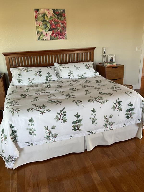 The Company Cotton™ Floral Berry Sateen Duvet Cover offers an artistic nod to winter with a print of sage, olive, and green boughs dotted by bright red berries. Set against a snow-white ground, the exclusive design is based on original hand-painted artwork. Crafted of buttery-soft and breathable sateen, this bedding collection has a subtle sheen and is perfect for all-season comfort.