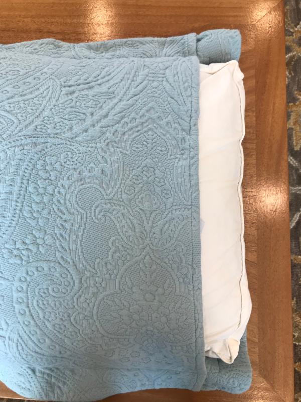 The Hillcrest Cotton Matelassé Shams are described as elegant, beautiful, and well-made, with a luxurious feel and texture. The matelassé pattern adds a sophisticated look, and the color options, particularly the "steel blue" and "cloud" shades, are praised for being rich, versatile, and true to the online images. Customers appreciate the substantial yet lightweight fabric that is easy to care for and maintains its shape well. Many reviewers note that the shams complement the matching coverlet beautifully, creating a cohesive and elegant bedding set. Overall, the shams are considered an excellent value and quality product.