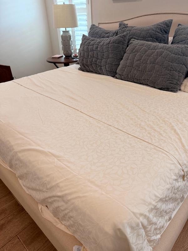 This jacquard-woven Supima® cotton sateen flat sheet gets a burst of natural beauty and subtle color from a yarn-dyed motif of tonal vining leaves. An elegant choice for the primary suite, this collection is jacquard woven in a lustrous sateen weave of Supima® cotton, the finest American-grown cotton available. Our easy-care bedding is heavy enough for cold temperatures and sleepers, but lightweight enough for year-round use.