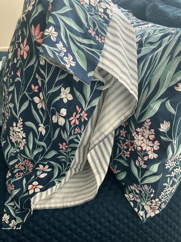 The artful Julienne Cotton Percale Sham is designed to mix, match, and layer, showcasing two contemporary florals in your choice of navy or taupe. For yet another layer of intriguing pattern play, the Julienne Mini Floral duvet cover, sham, and comforter reverse to a complementary pinstripe. Our breathable percale bedding collection is an excellent choice for year-round use and hot sleepers.
