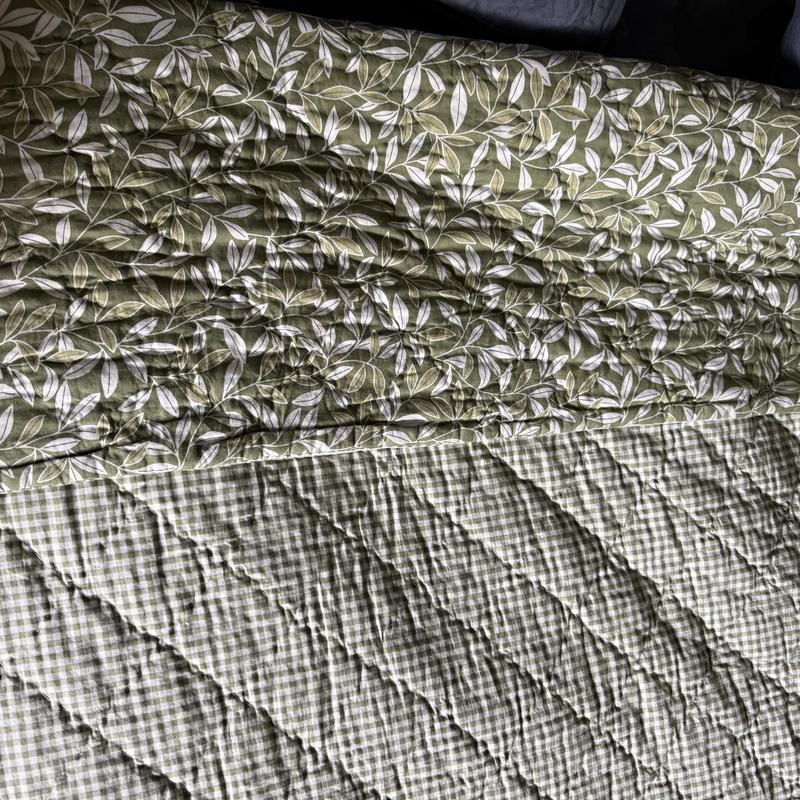 This Julienne Leaf reversible cotton quilt is framed with a gingham border and patterned with branching leaves in your choice of navy blue or olive green. Reversing to a gingham backing for twice the look, it layers with our coordinating Julienne Floral and Julienne Mini Floral sheeting, as well as our Julienne pillow covers (sold separately) for a fun mix of complementary prints. Quilt and Sham are handcrafted of pure cotton that’s been washed for inviting softness.