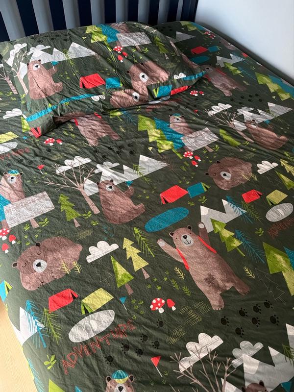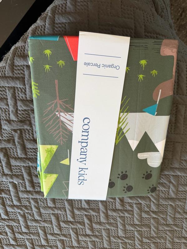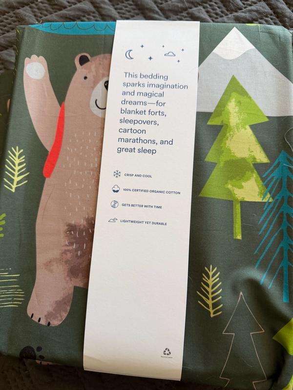 Woodland adventures are to be had here at Bear Camp! Illustrated with tents, pine trees, mushrooms, mountain ranges and, of course, friendly bears, this camping-inspired collection sets the scene for sweet dreams under the stars. Set against a forest green ground, it’s designed mix and layer with our Forest Friends percale bedding (sold separately). Sewn of organic cotton percale, this earth-friendly collection has a cool, crisp hand that gets better with every wash.