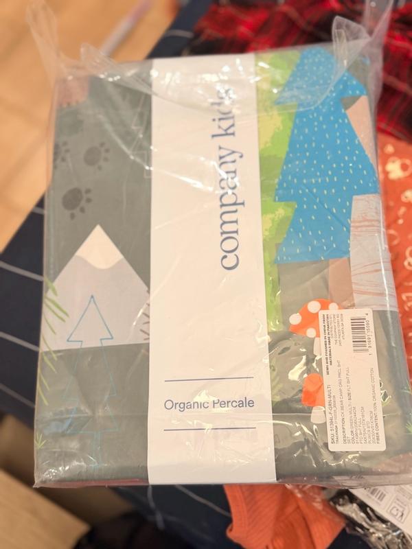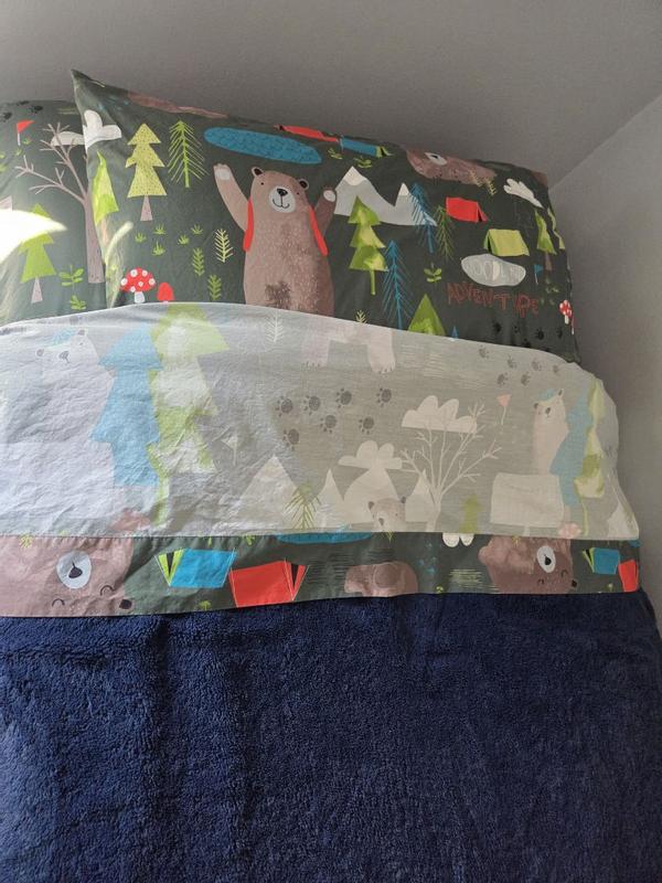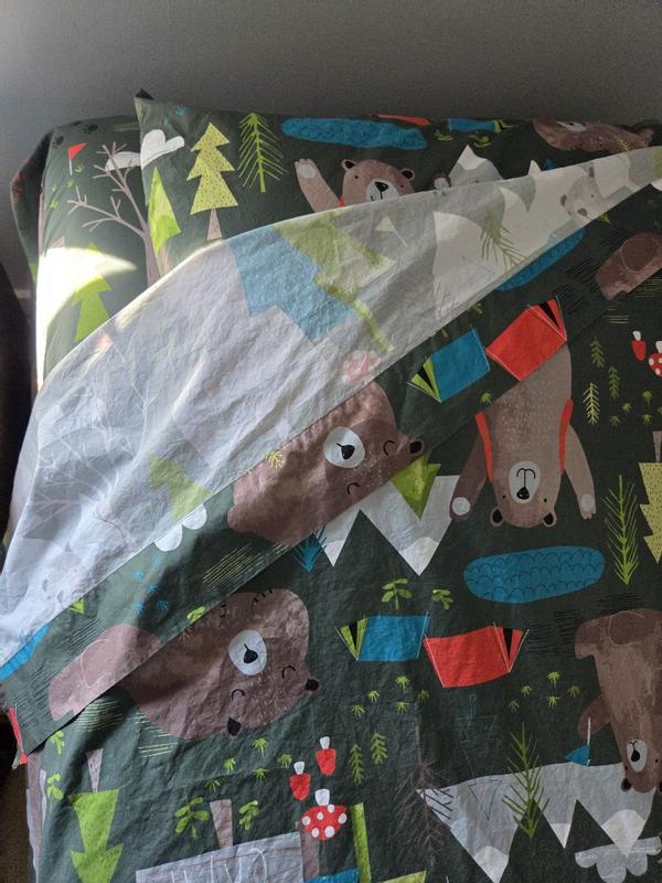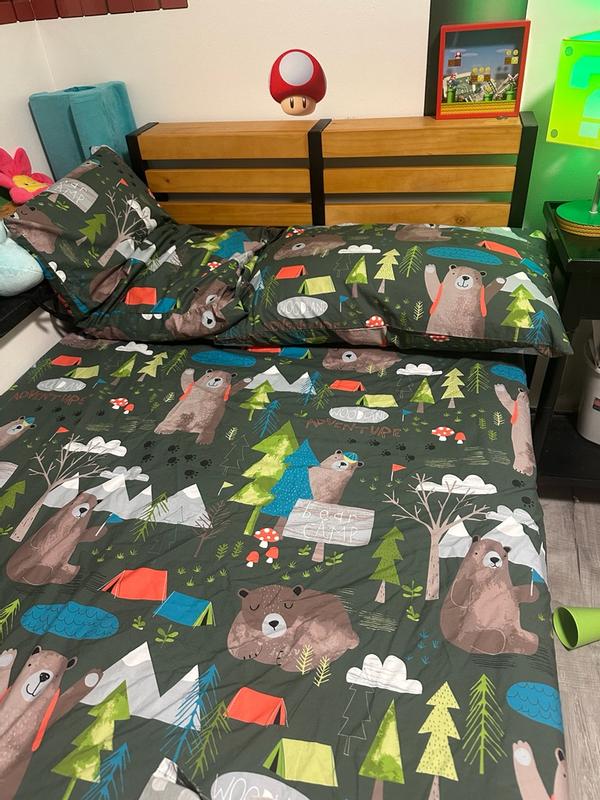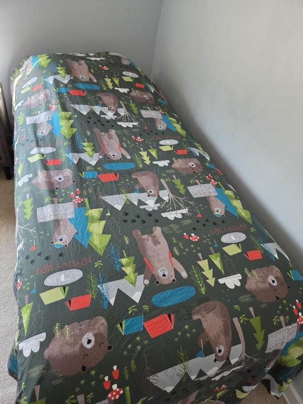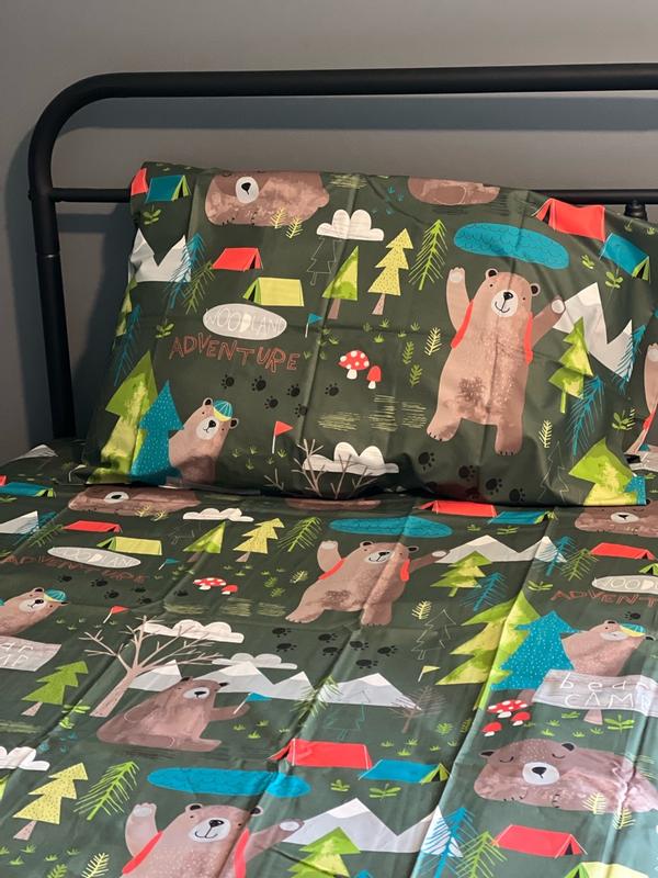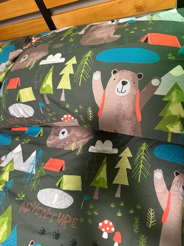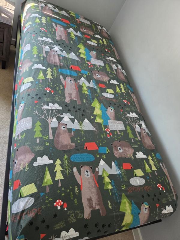 Woodland adventures are to be had here at Bear Camp! Illustrated with tents, pine trees, mushrooms, mountain ranges and, of course, friendly bears, this camping-inspired collection sets the scene for sweet dreams under the stars. Set against a forest green ground, it’s designed mix and layer with our Forest Friends percale bedding (sold separately). Sewn of organic cotton percale, this earth-friendly collection has a cool, crisp hand that gets better with every wash.