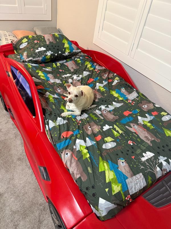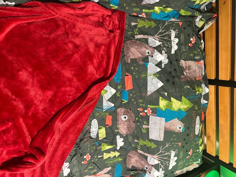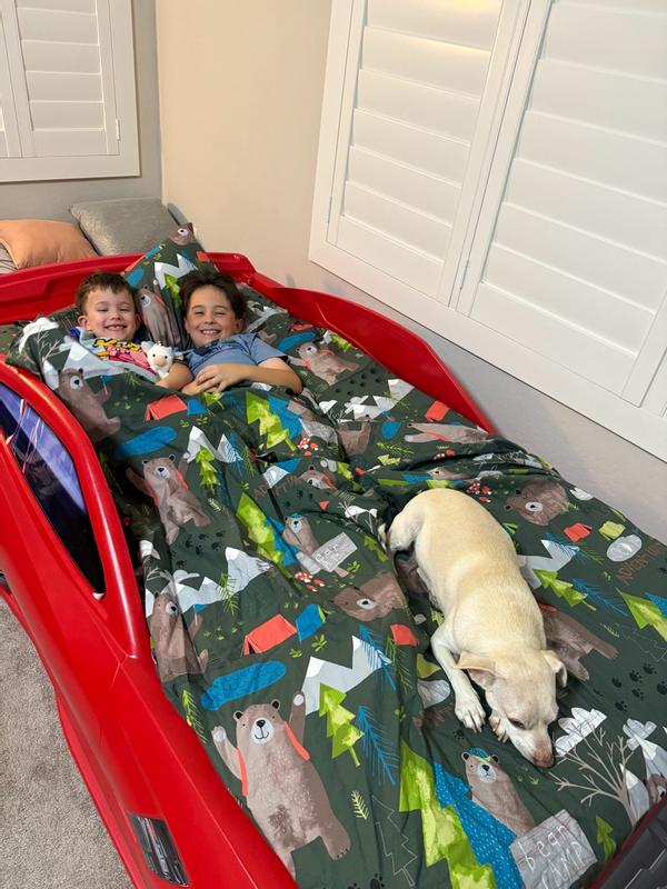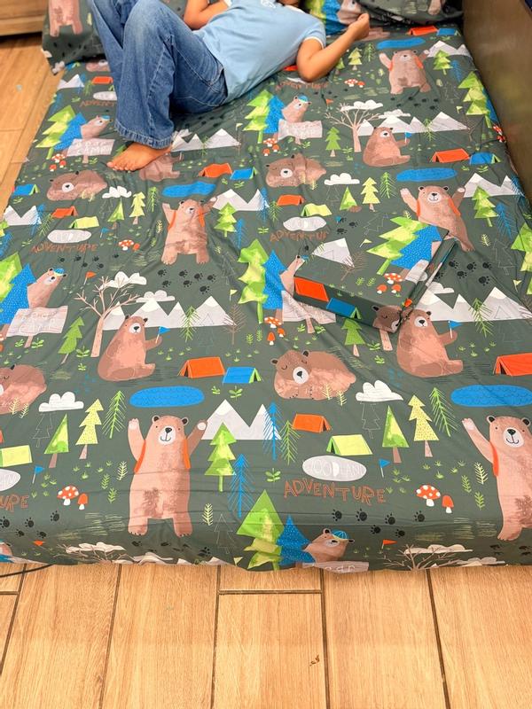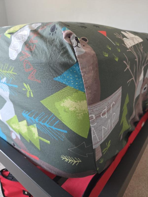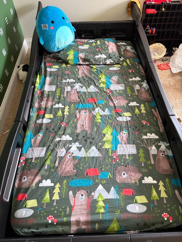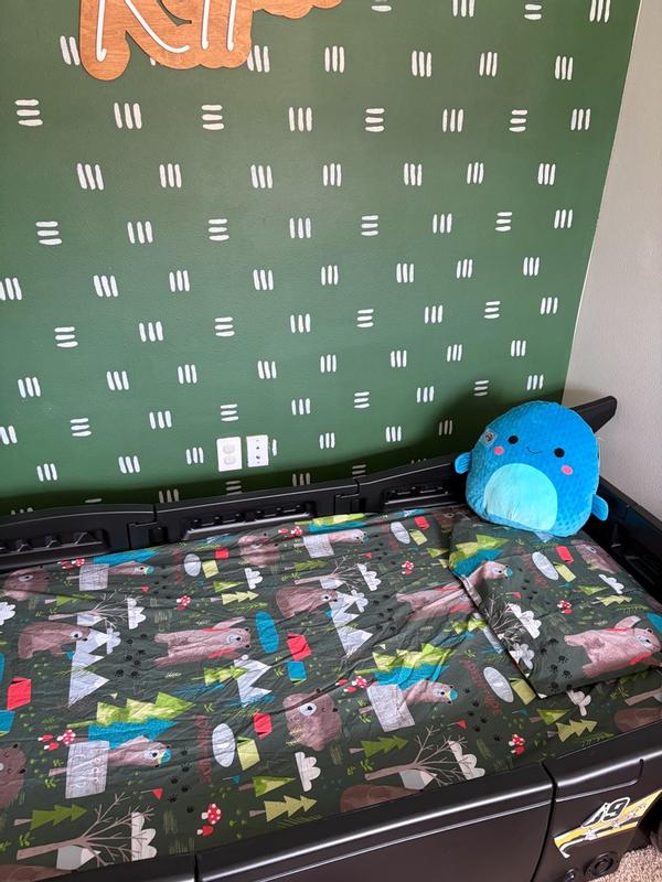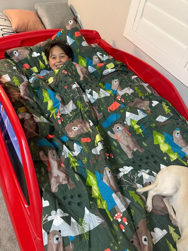 Woodland adventures are to be had here at Bear Camp! Illustrated with tents, pine trees, mushrooms, mountain ranges and, of course, friendly bears, this camping-inspired collection sets the scene for sweet dreams under the stars. Set against a forest green ground, it’s designed mix and layer with our Forest Friends percale bedding (sold separately). Sewn of organic cotton percale, this earth-friendly collection has a cool, crisp hand that gets better with every wash.