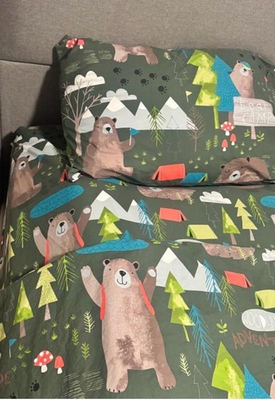 Woodland adventures are to be had here at Bear Camp! Illustrated with tents, pine trees, mushrooms, mountain ranges and, of course, friendly bears, this camping-inspired collection sets the scene for sweet dreams under the stars. Set against a forest green ground, it’s designed mix and layer with our Forest Friends percale bedding (sold separately). Sewn of organic cotton percale, this earth-friendly collection has a cool, crisp hand that gets better with every wash.
