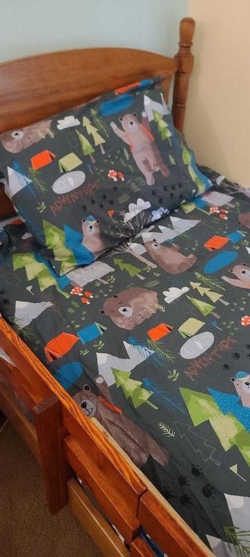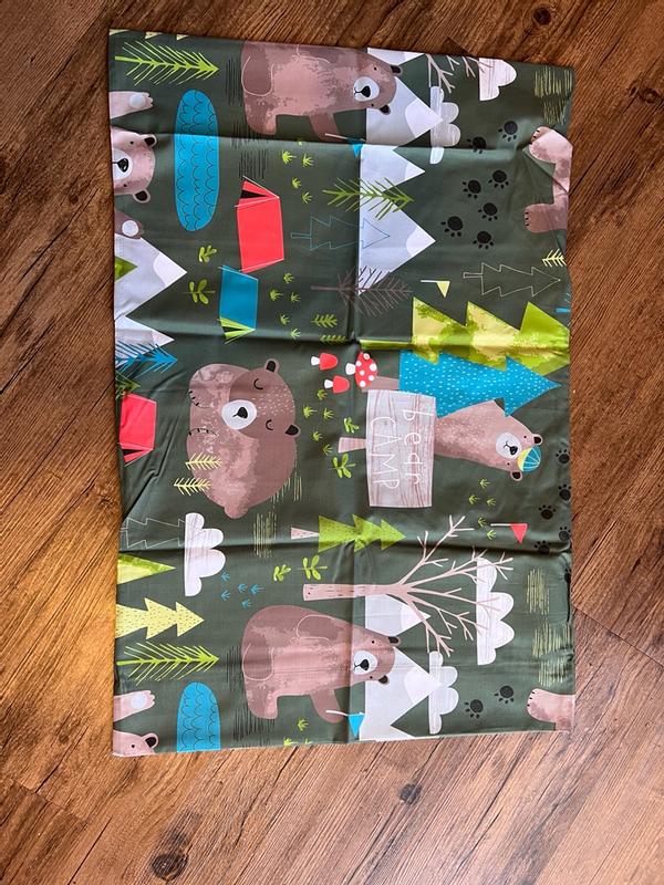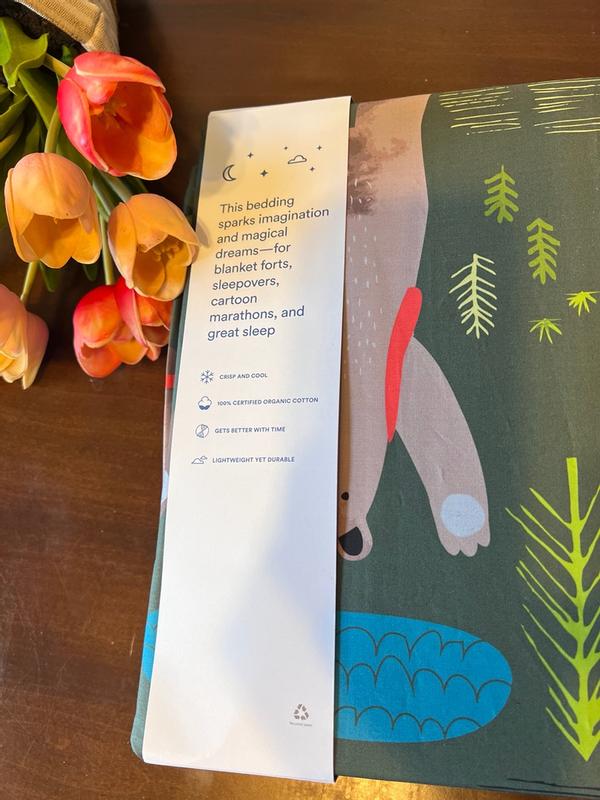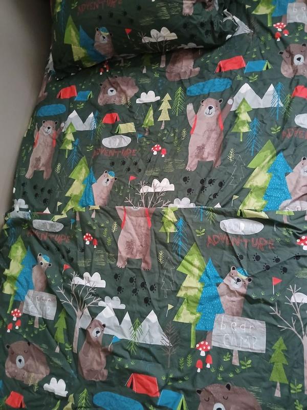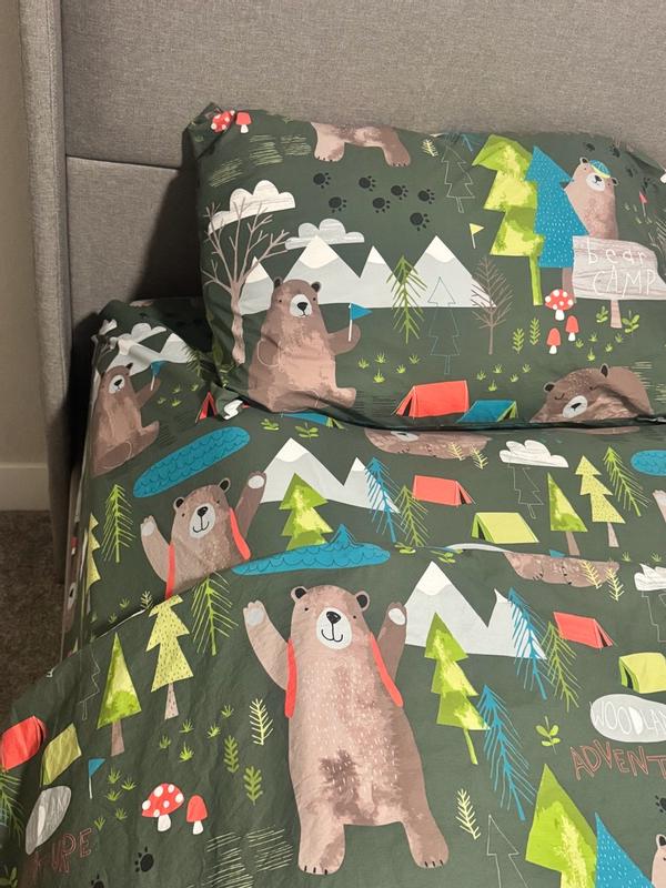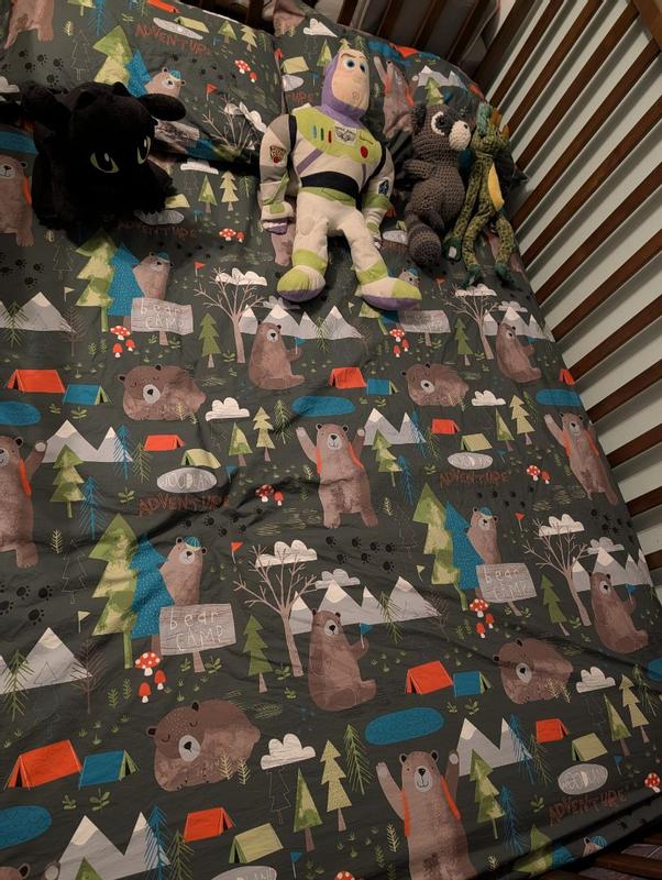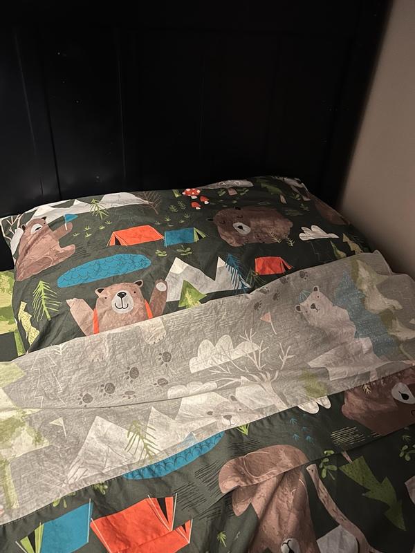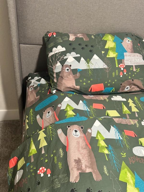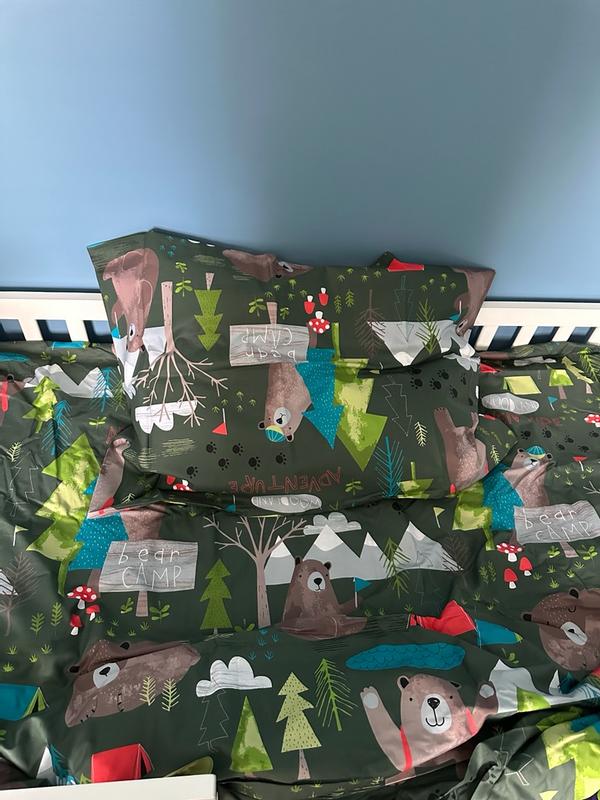 Woodland adventures are to be had here at Bear Camp! Illustrated with tents, pine trees, mushrooms, mountain ranges and, of course, friendly bears, this camping-inspired collection sets the scene for sweet dreams under the stars. Set against a forest green ground, it’s designed mix and layer with our Forest Friends percale bedding (sold separately). Sewn of organic cotton percale, this earth-friendly collection has a cool, crisp hand that gets better with every wash.