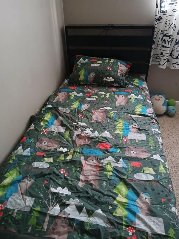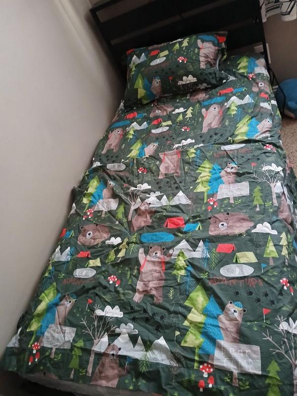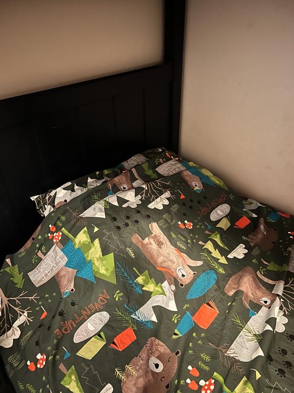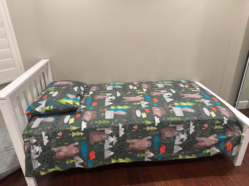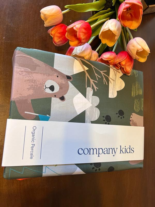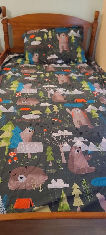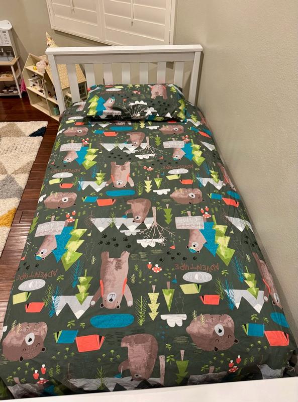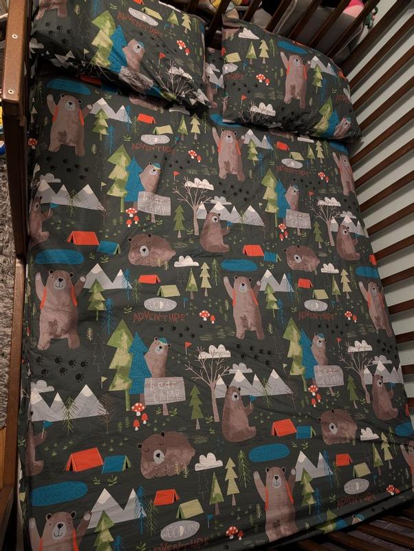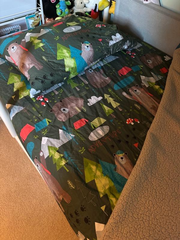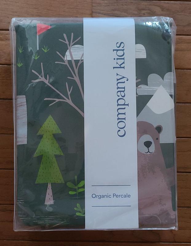 Woodland adventures are to be had here at Bear Camp! Illustrated with tents, pine trees, mushrooms, mountain ranges and, of course, friendly bears, this camping-inspired collection sets the scene for sweet dreams under the stars. Set against a forest green ground, it’s designed mix and layer with our Forest Friends percale bedding (sold separately). Sewn of organic cotton percale, this earth-friendly collection has a cool, crisp hand that gets better with every wash.