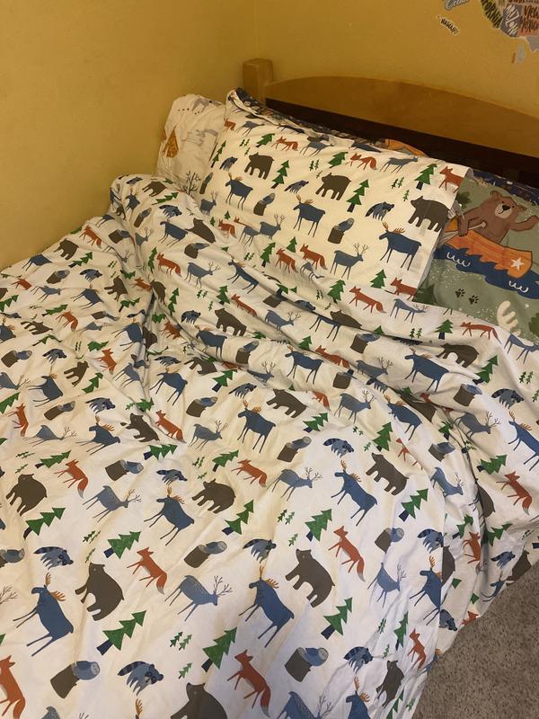 Friendly forest denizens wander amongst the pine trees of this playful bedding collection. Featuring bears, raccoons, moose, owls, foxes and deer, the crisp white background makes the fun woodland scene a colorful standout. This original print can be layered with our Bear Camp percale bedding (collection). Sewn of organic cotton percale, this earth-friendly collection has a cool, crisp hand that gets better with every wash.