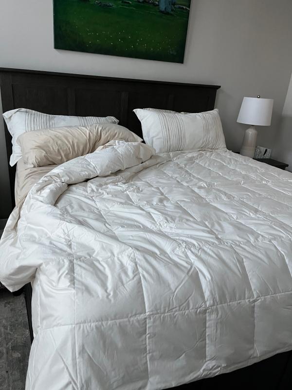This product is described as a high-quality, versatile down blanket that provides a comfortable balance of warmth and lightweight breathability. Customers praise its cozy yet breathable nature, making it suitable for use year-round. The blanket is well-made, durable, and easy to care for, with no issues reported. It is suitable for both hot and cool sleepers, serving as a lightweight layer or primary blanket. Overall, the reviews highlight the product's exceptional quality, comfort, and value.