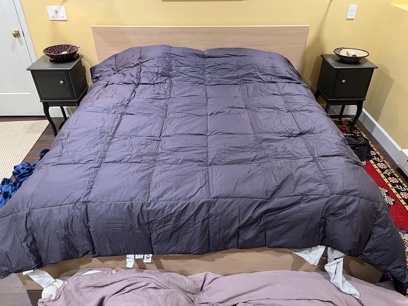 The down comforter is praised for its exceptional quality, warmth, and comfort. Customers describe it as cozy, fluffy, and like sleeping in a cloud. The comforter comes in appealing colors that customers love, and many report buying it multiple times due to its durability and performance. It is versatile, providing the right amount of warmth for different seasons and climates.