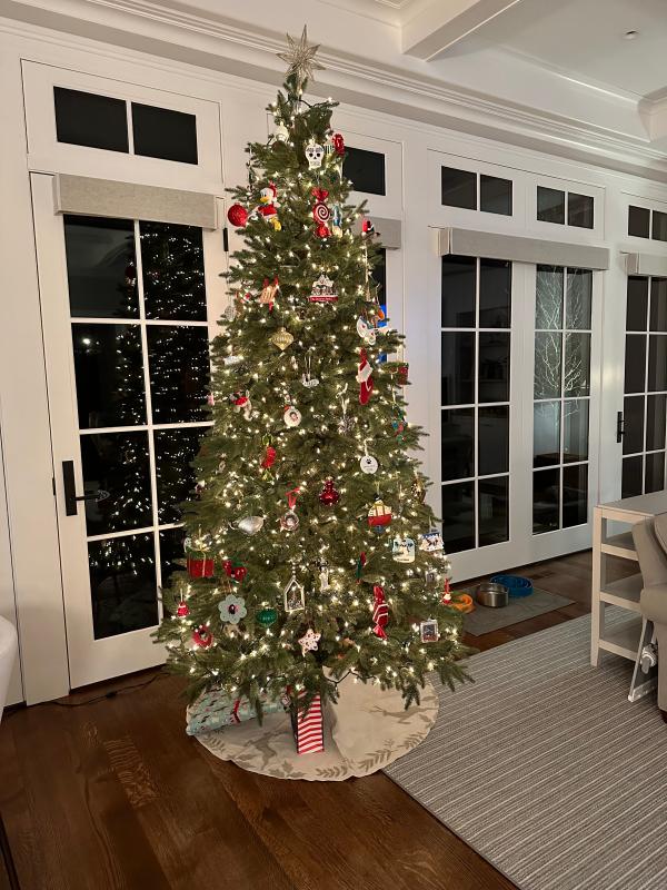 The Christmas tree skirt is well-made, fully lined, and a great size that fits nicely under the tree. It features a lovely red color with embroidered patterns like pine cones, birds, and reindeer that add a touch of holiday cheer. Customers consistently praise its high quality, beautiful design, and elegant appearance, noting that it is classic, classy, and will last for many Christmas seasons.