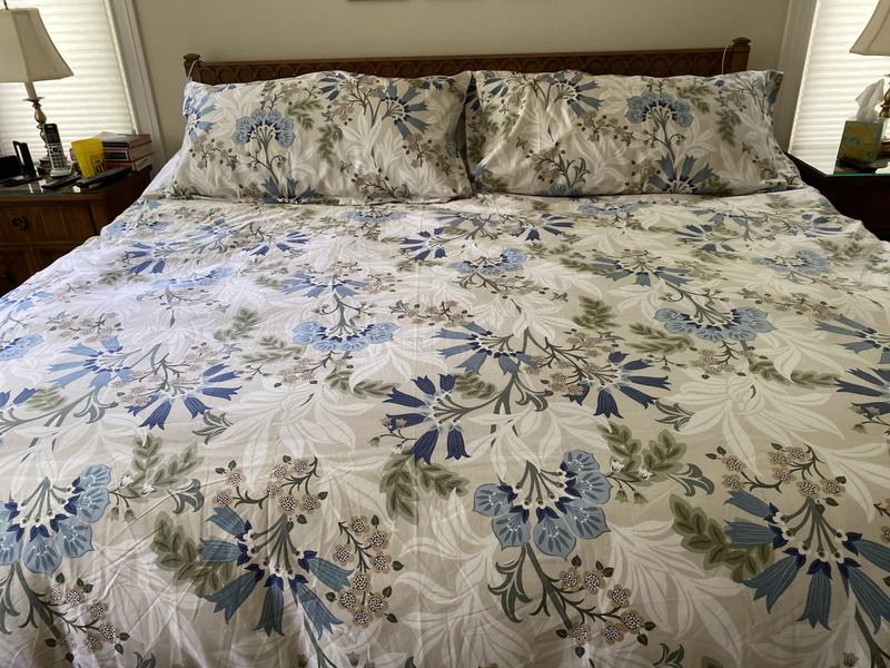Printed with elevated blooms blown up to a dramatic scale, our Lila Floral Cotton Sateen Duvet Cover adds a tropical touch to contemporary or more traditional spaces. The design is rendered in palette of chambray, indigo, white, sage, sand, and palm green on a beige ground. Crafted of buttery-soft and breathable sateen, this bedding collection has a subtle sheen and wrinkle-free finish and is perfect for all-season comfort.