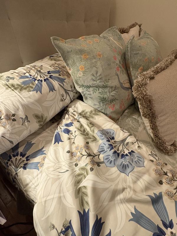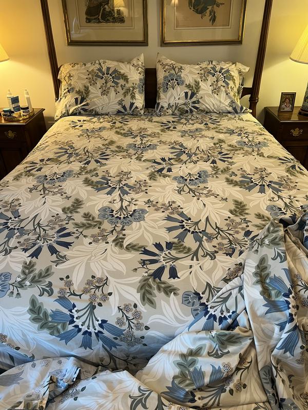 The dramatic blooms on our Lila Floral Cotton Sateen Sheet Set add a tropical touch to contemporary and more traditional settings. This elevated print is rendered in palette of chambray, indigo, white, sage, sand, and palm green on a beige ground. Crafted of buttery-soft and breathable sateen, this bedding collection has a subtle sheen and wrinkle-free finish and is perfect for all-season comfort.
