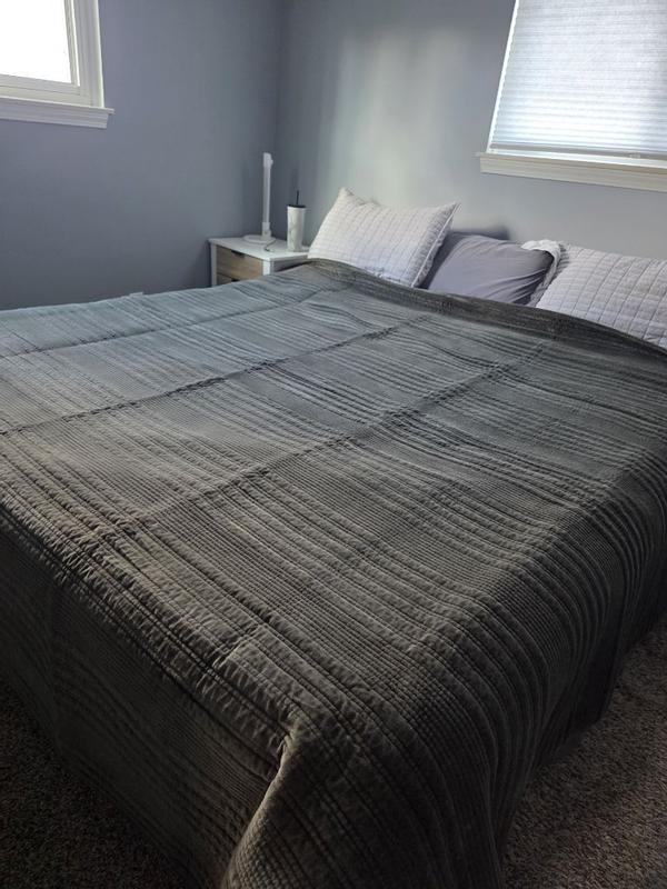 The quilt is described as having a soft, velvety texture and substantial weight that provides warmth without feeling too heavy. Customers praise the high-quality stitching and refined, elevated look that complements various decor styles. The quilt is noted for its breathability, year-round usability, easy care, and durability, retaining its color and shape over time. Many comment on the generous size that allows for elegant draping on a king or California king bed.