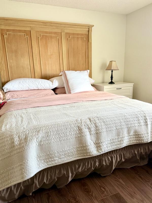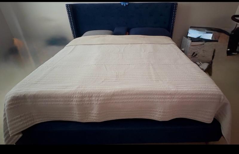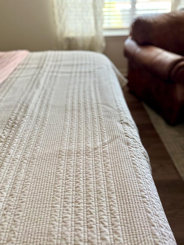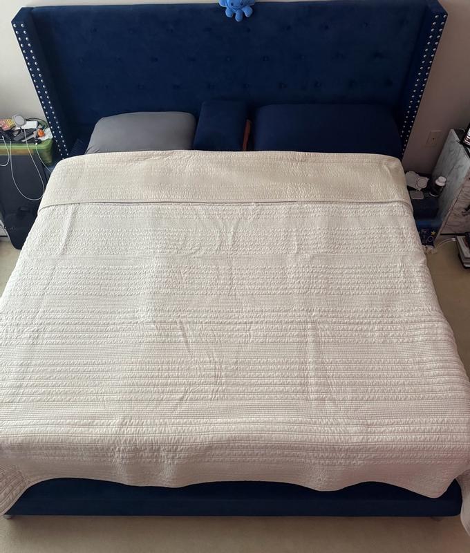 The quilt is described as having a soft, velvety texture and substantial weight that provides warmth without feeling too heavy. Customers praise the high-quality stitching and refined, elevated look that complements various decor styles. The quilt is noted for its breathability, year-round usability, easy care, and durability, retaining its color and shape over time. Many comment on the generous size that allows for elegant draping on a king or California king bed.