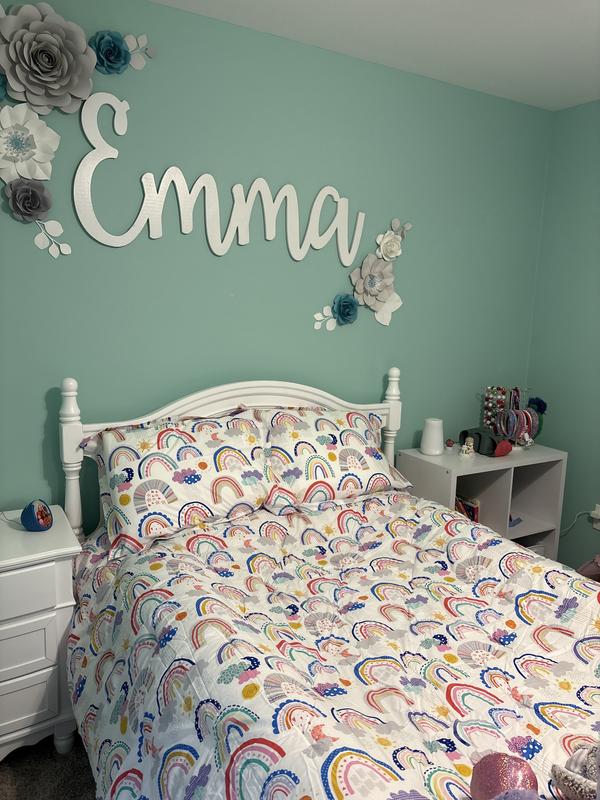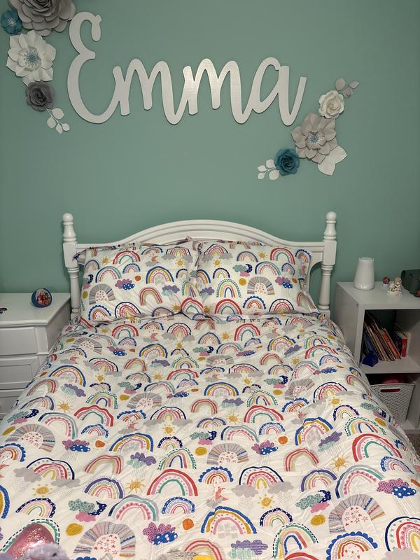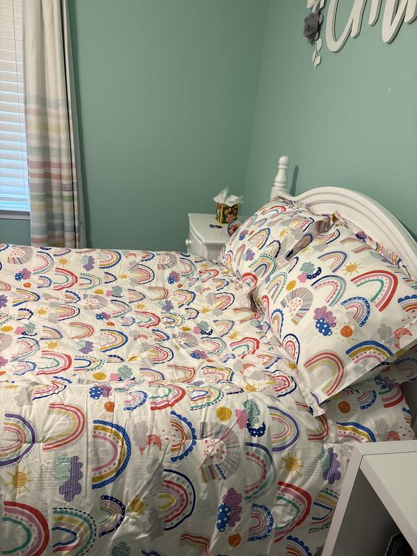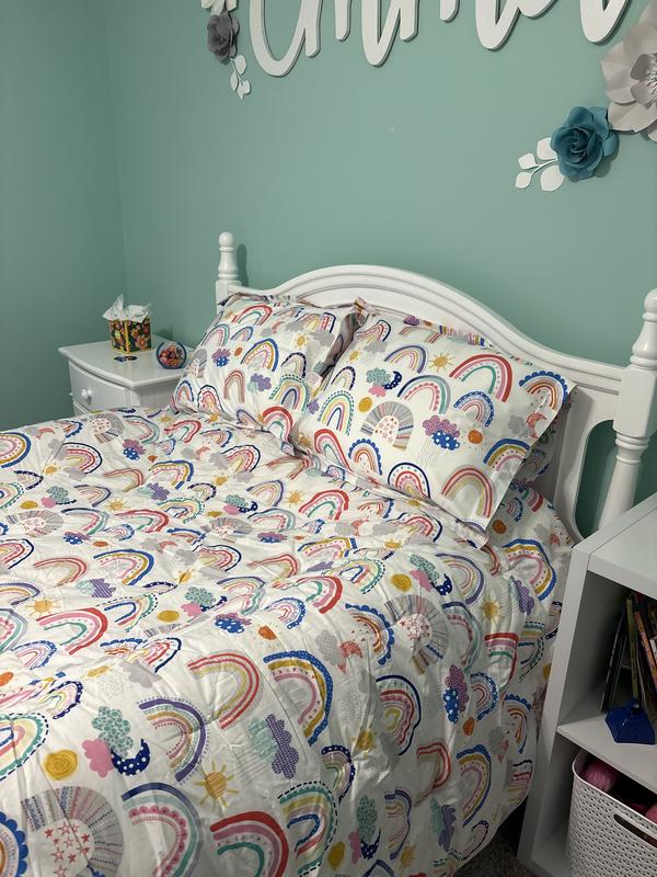 Our Magical Rainbows Percale Kids Comforter Set brings enchantment and wonder to bedtime with rainbows, stars, moons, and clouds in happy hues like orange, turquoise, yellow, and pink. Sewn of organic cotton percale, each pieces in this earth-friendly collection has a cool, crisp hand that gets better with every wash.