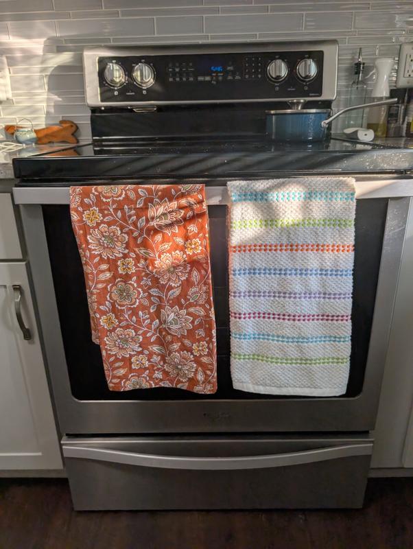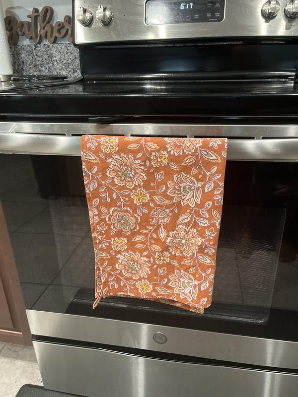 Our Mix & Match Printed Cotton Tea Towels feature autumnal florals in shades of terracotta, russet, gold, green, and white, and are designed to layer. The quilted placemats reverse to a charming gingham print for even more pattern play. Set of 2.