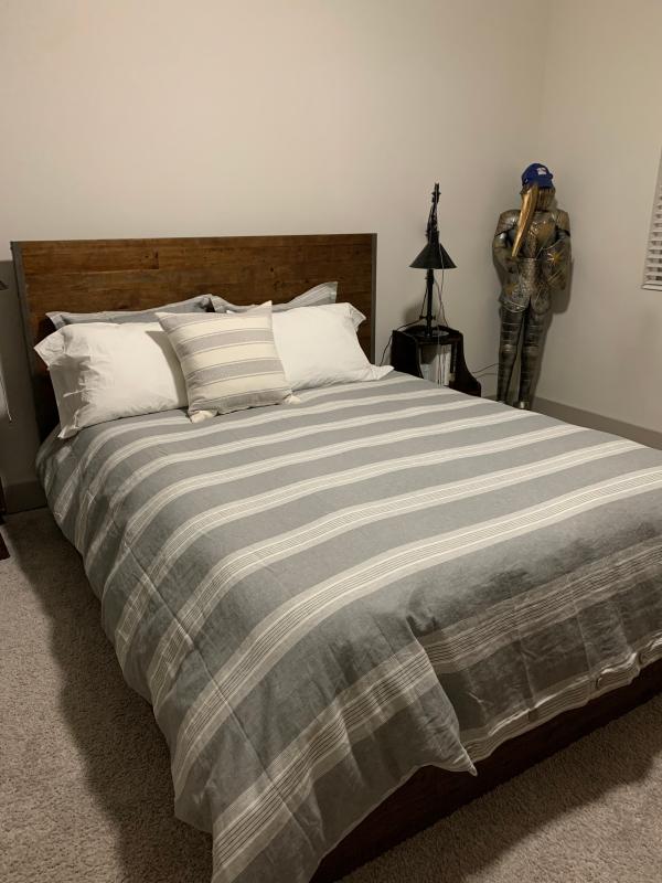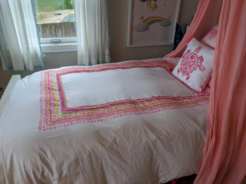 - Comforter’s corner loops attach to duvet cover’s ties to secure both in place