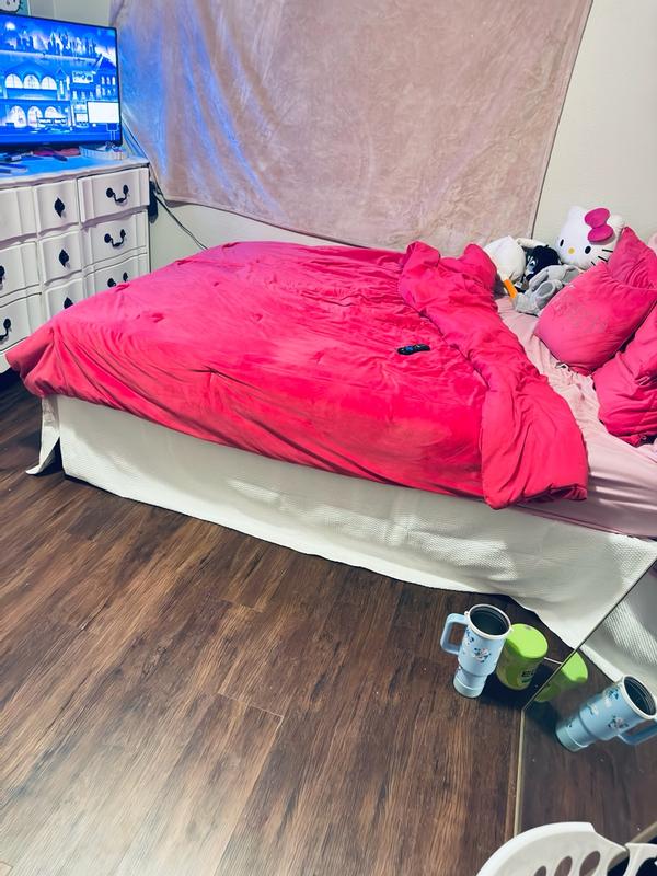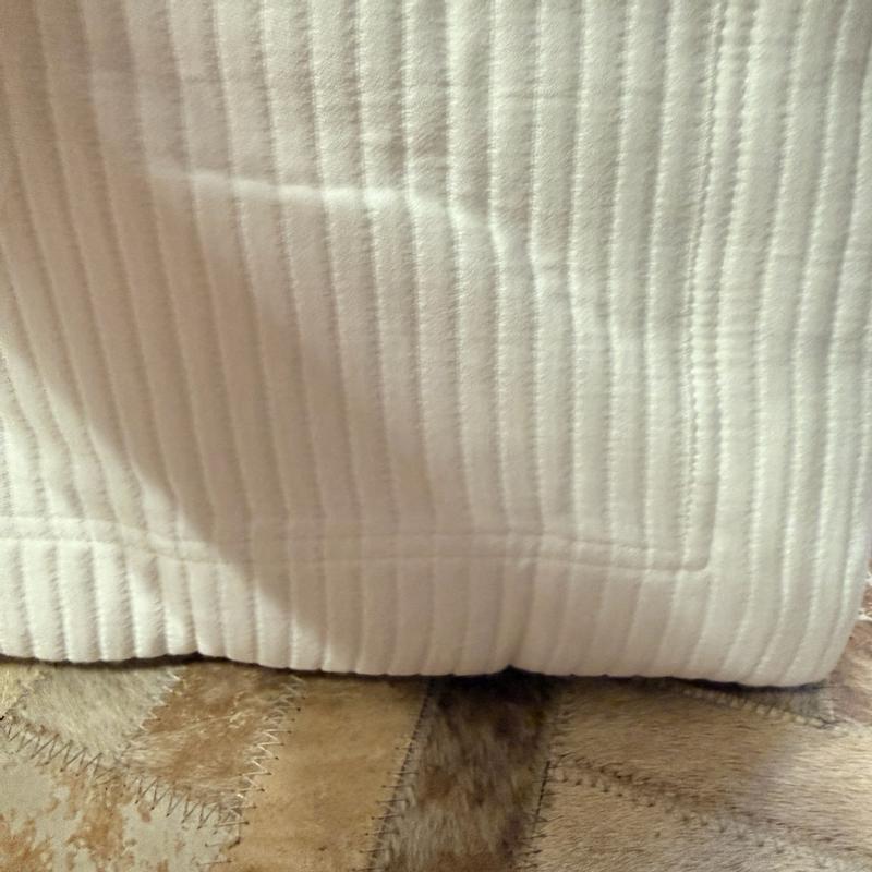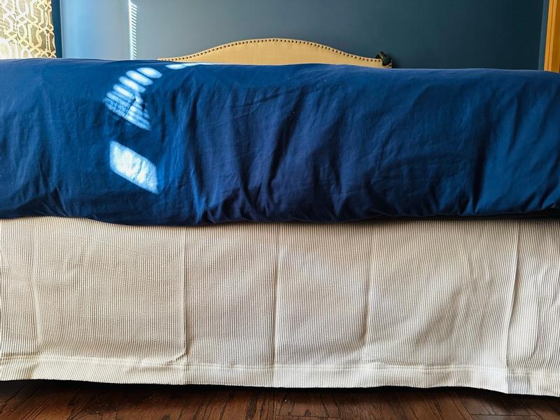 The product features a high-quality, soft cotton fabric that creates a luxurious, hotel-like look and feel. The thick, durable material conceals the box spring and under-bed storage, giving the bed a polished, finished appearance. The subtle vertical stripe pattern is described as timeless and versatile, complementing a wide range of bedding styles. Reviewers appreciate the skirt's easy care and durability through washing.