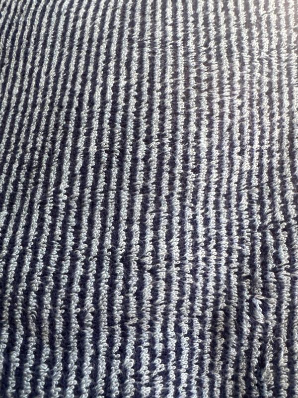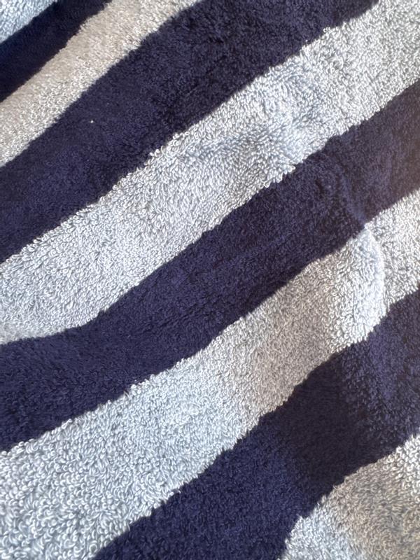 This is an awesome towel! It’s not too thin, not too heavy so it dries fairly quickly but it still is heavy enough to dry you off. It’s made of 100% cotton and very soft. I love the pattern on both side sides, one side with white stripes, the other side of their narrow stripes.