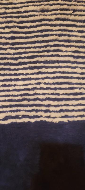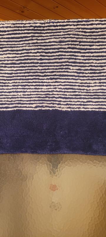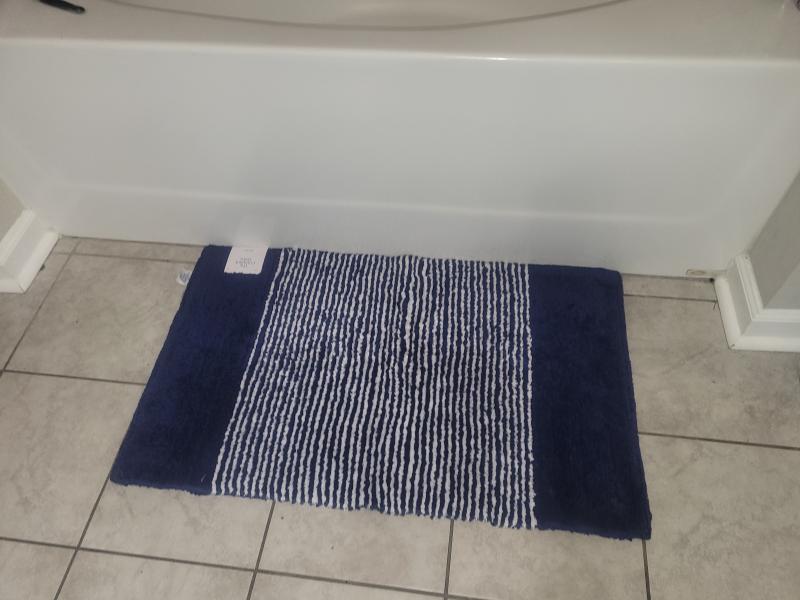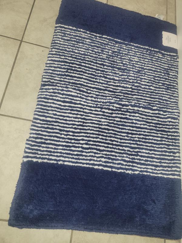 - Bands of narrow pinstripes pattern this reversible bath rug