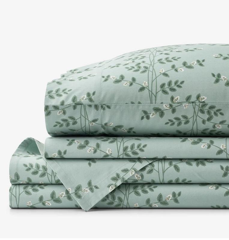 Inspired by nature's most restful tones, the Rifle Paper Co. Climbing Vines Cotton Percale Sheet Set brings verdant beauty to the bed with delicate tendrils in shades of fern and evergreen against a soft sage field. This collection can be layered with our coordinating Climbing Vines Border percale sheets (sold separately). Our breathable percale bedding collection is an excellent choice for year-round use. Rifle Paper Co.'s hand-painted designs bloom across our premium bedding, with bold colors and florals to bring beauty to your everyday. Part of our Rifle Paper Co. x The Company Store collection.
