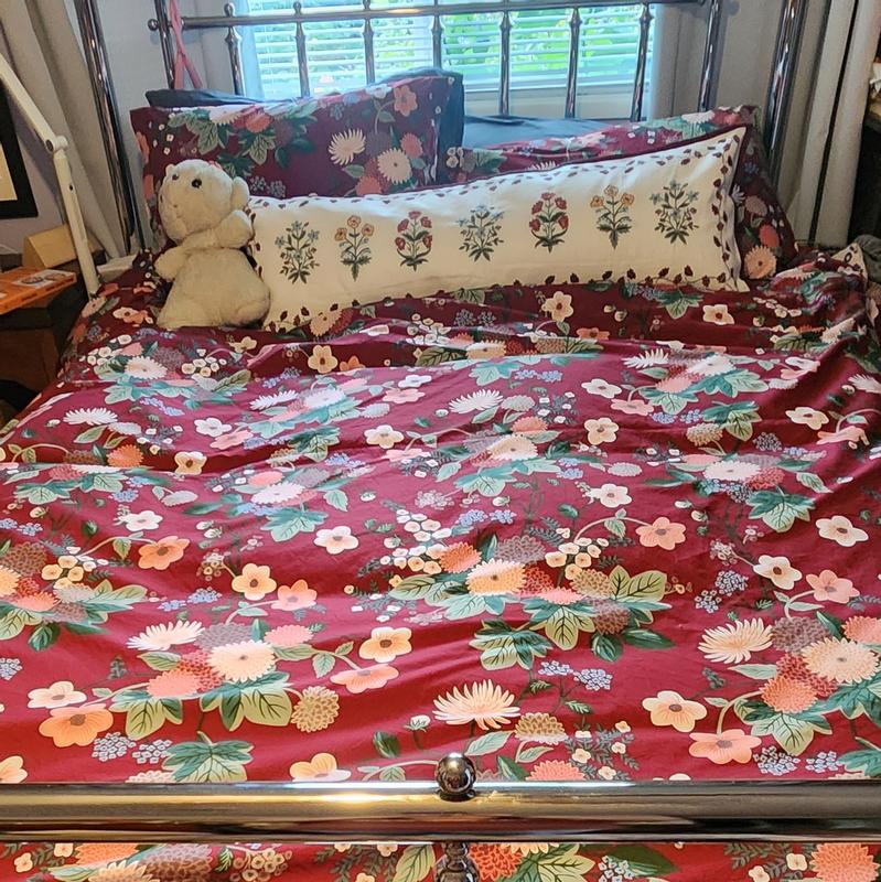 The Rifle Paper Co. Dahlia Cotton Percale Duvet Cover features a timeless floral print of illustrated, vintage-inspired blooms in two colorways. Choose vibrant hues against a crisp white backdrop, or soft muted tones set against a rich burgundy. Our breathable percale bedding collection is an excellent choice for year-round use. Rifle Paper Co.'s hand-painted designs bloom across our premium bedding, with bold colors and florals to bring beauty to your everyday. Part of our Rifle Paper Co. x The Company Store collection.