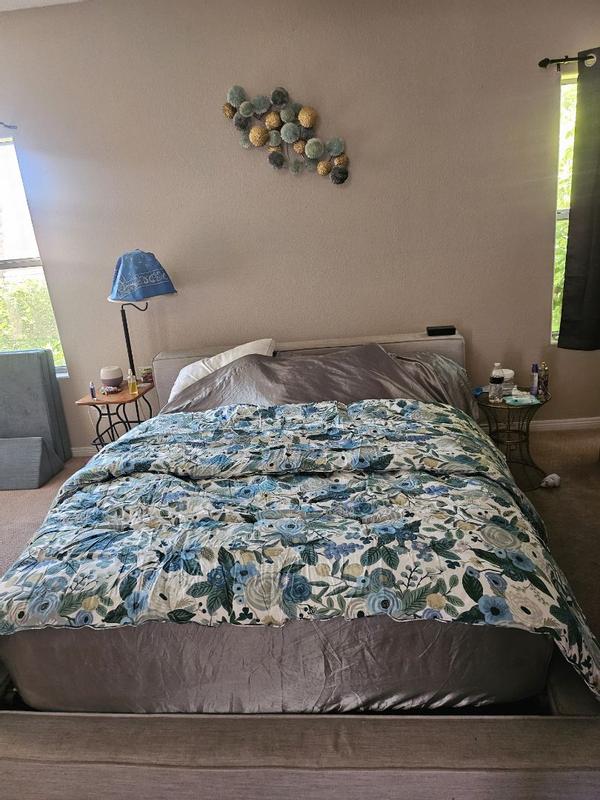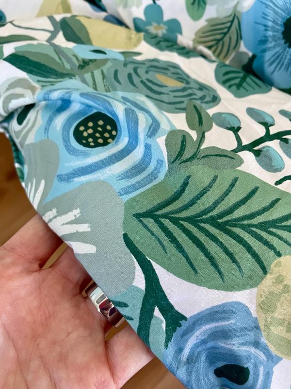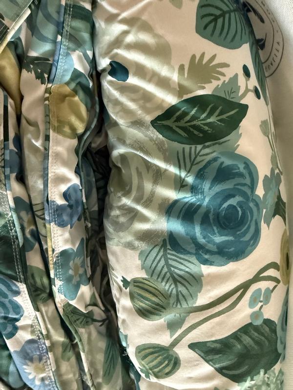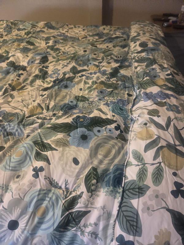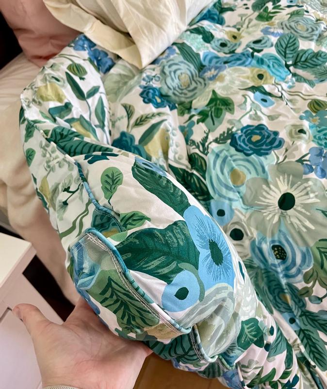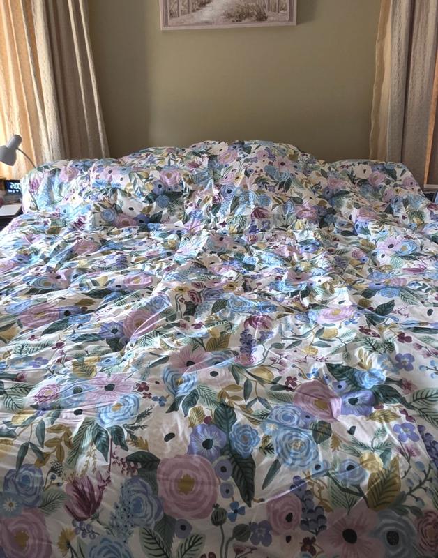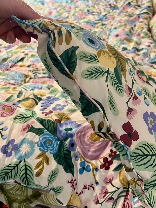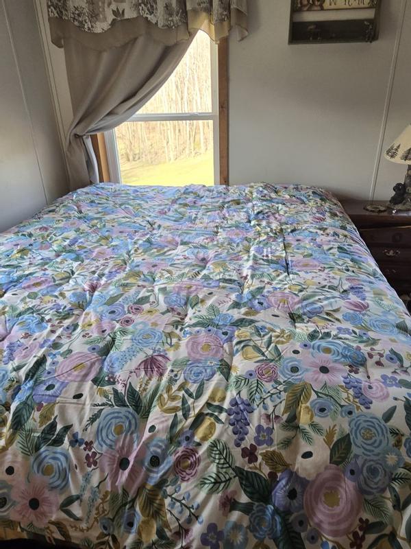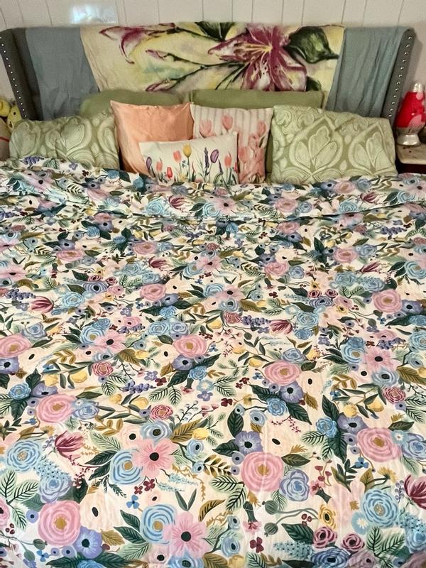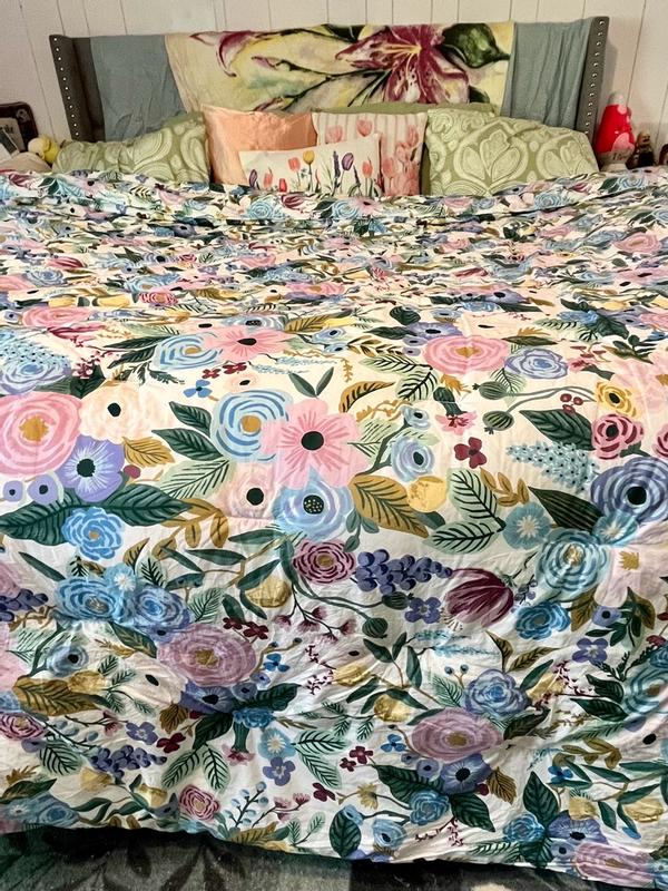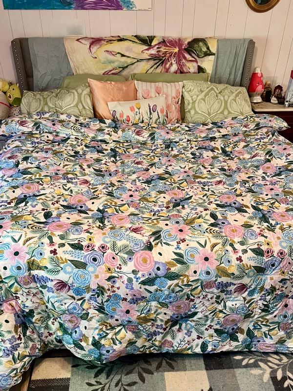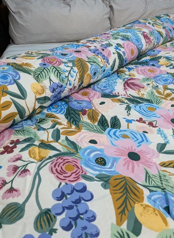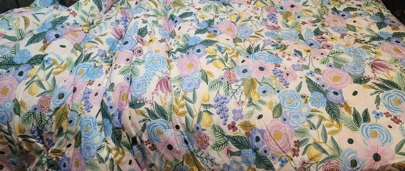 The Rifle Paper Co. Garden Party comforter is praised for its beautiful, vibrant floral design, soft and high-quality fabric, and excellent craftsmanship. Customers describe the comforter as cheerful, colorful, and gorgeous, with the pattern being even more stunning in person. The comforter is also noted for being warm, cozy, and the perfect weight for various seasons. Many reviewers find the reversible and versatile design to be a positive feature. While a few customers expressed minor disappointments, the majority of customers are highly satisfied with the product.
