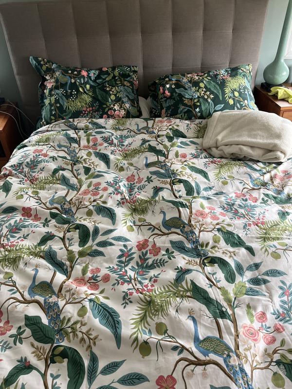Bring the outdoors to your bed: The Rifle Paper Co. Juniper Forest Sateen Duvet Cover is illustrated with clusters of berries, hanging moss, pinecones, and trailing botanicals in restful shades of green, brass, pale gray, and white on a pine green ground. Crafted of buttery-soft and breathable sateen, this bedding collection has a subtle sheen and is perfect for all-season comfort. Rifle Paper Co.'s hand-painted designs of floral blooms and bold colors bring beauty to your everyday. Part of our Rifle Paper Co. x The Company Store collection.
