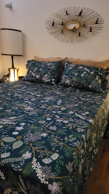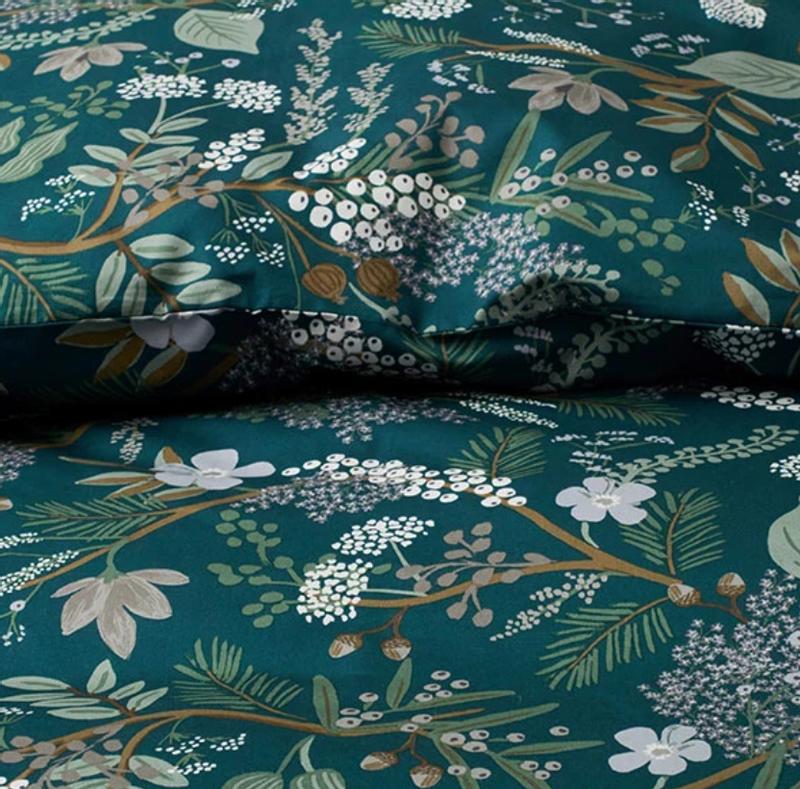 Bring the outdoors to your bed: The Rifle Paper Co. Juniper Forest Sateen Sheet Set is illustrated with clusters of berries, hanging moss, pinecones, and trailing botanicals in restful shades of green, brass, pale gray, and white on a pine green ground. Crafted of buttery-soft and breathable sateen, this bedding collection has a subtle sheen and is perfect for all-season comfort. Rifle Paper Co.'s hand-painted designs of floral blooms and bold colors bring beauty to your everyday. Part of our Rifle Paper Co. x The Company Store collection.
